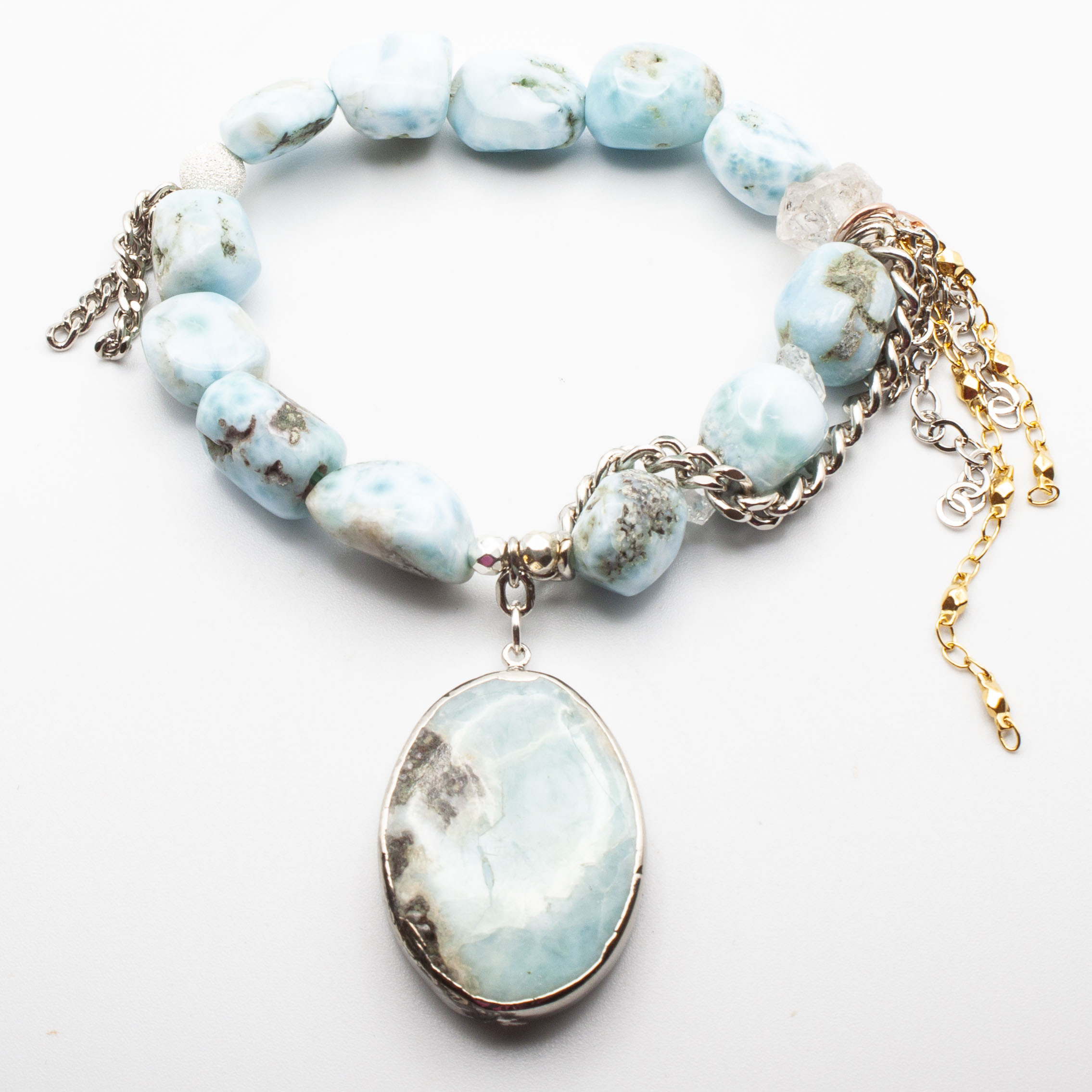 Larimar with a sterling silver wrapped larimar pendant. Sterling silver stardust accent bead and silver rhodium chain and tasseling. Fancy cut. 7″ stretch bracelet.