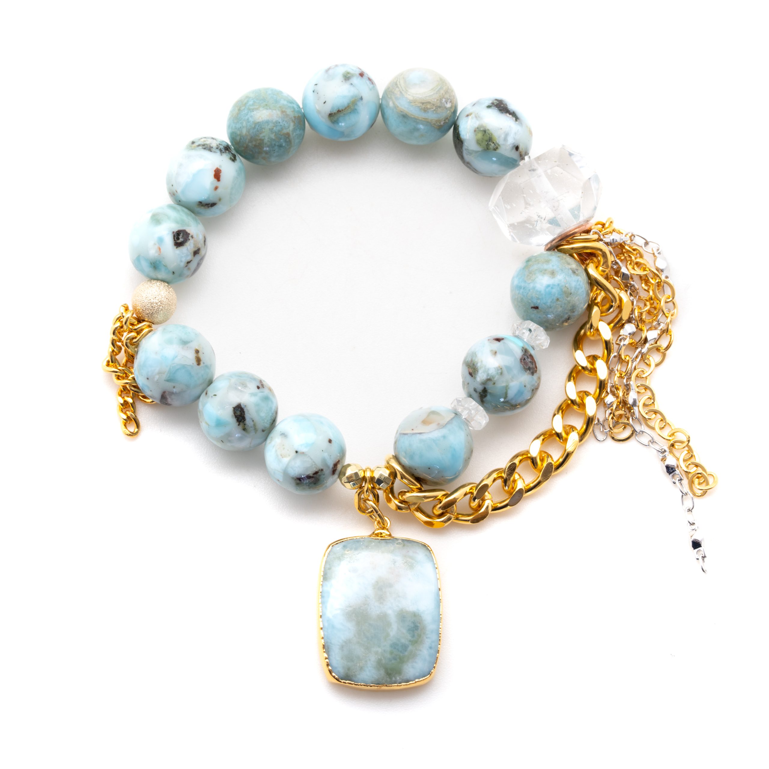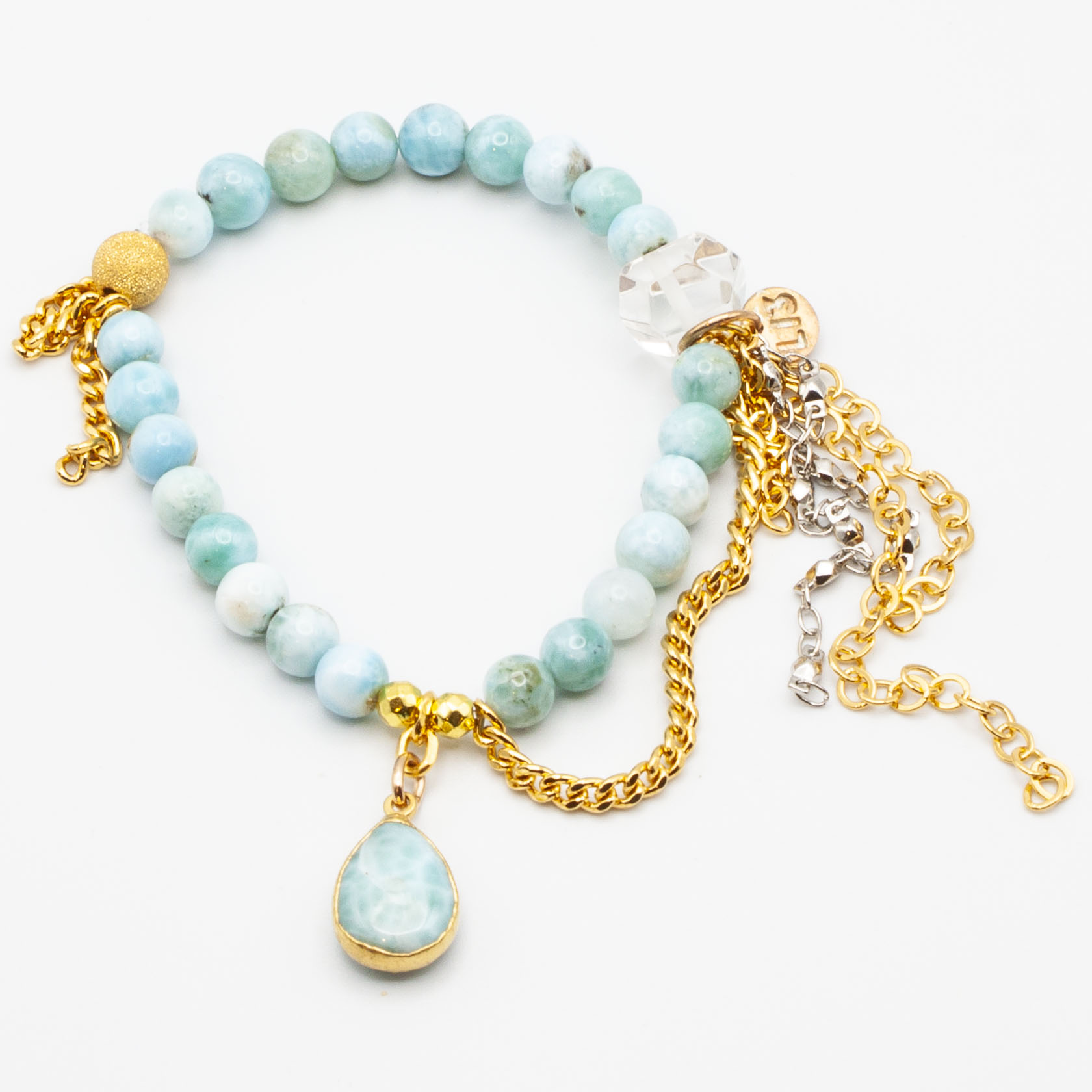 Larimar with a 18kt gold plate wrapped larimar pendant. 18kt gold stardust accent bead and gold and rhodium chain and tasseling. 8mm bead. 7 inch stretch bracelet.