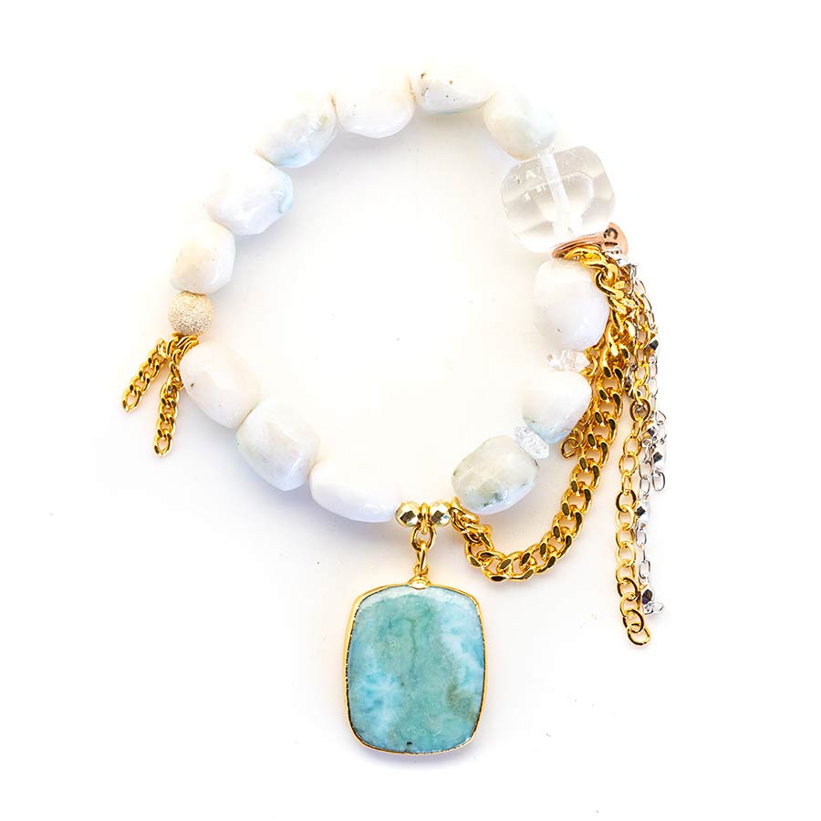 Fancy cut larimar with a 18kt gold plate wrapped larimar pendant. 18kt gold stardust accent bead and gold rhodium chain and tasseling. Quartz crystal accents. 7″ stretch bracelet.