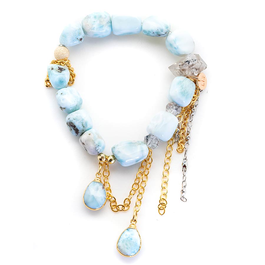 Larimar with 18kt gold plate wrapped larimar pendants. 18kt gold stardust accent bead and gold rhodium chain and tasseling. Herkimer diamond accents. 7 inch stretch bracelet.