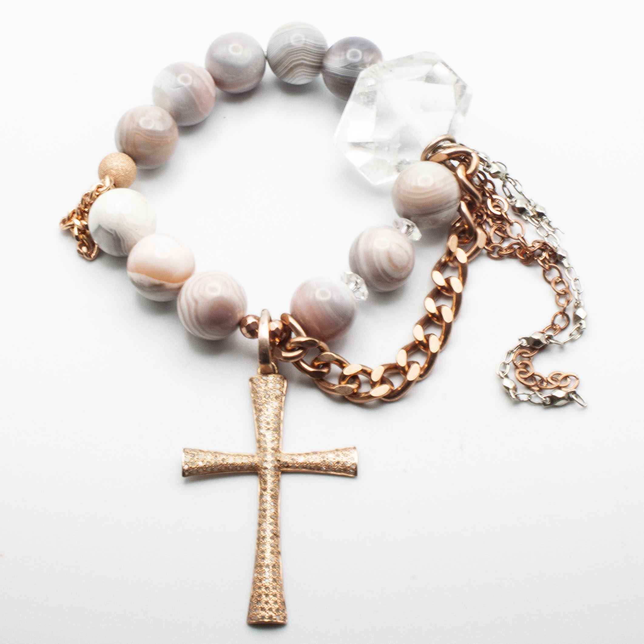 Lavender Botswana agate with a diamond cross pendant. 18kt rose gold stardust accent bead and rose gold rhodium chain and tasseling. 12mm 7″ stretch bracelet.