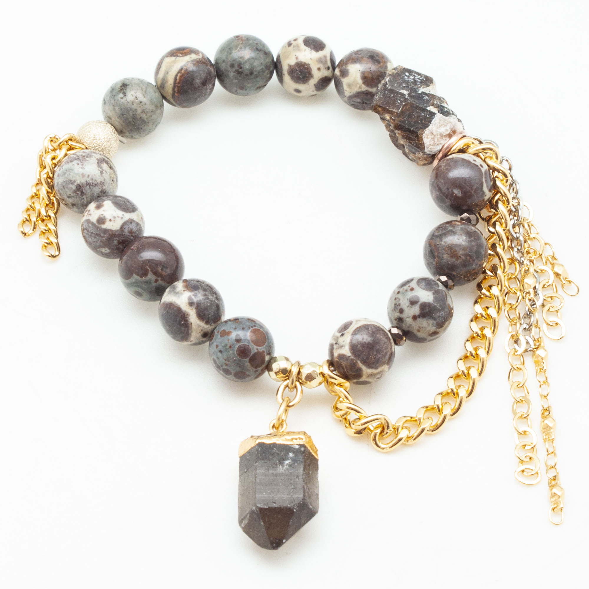 Leopard jasper with a 18kt gold plate wrapped smoky quartz crystal pendant. 18kt gold stardust accent bead and gold rhodium chain and tasseling. 10mm 7 inch stretch bracelets.
