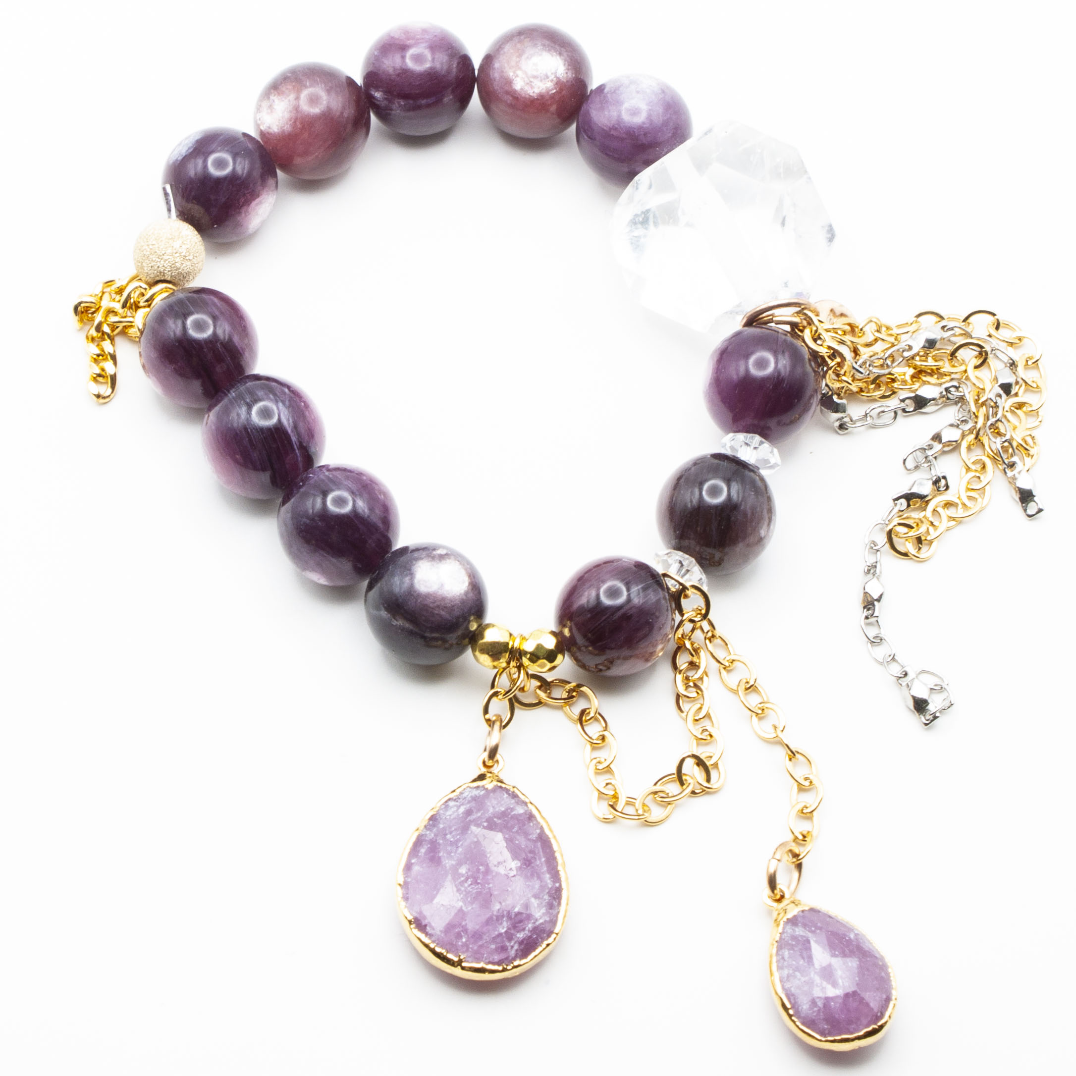 Lepidolite with 18kt gold plate wrapped pink sapphires. 18kt gold stardust accent bead and gold rhodium chain and tasseling. 12mm bead. 7 inch stretch bracelet.