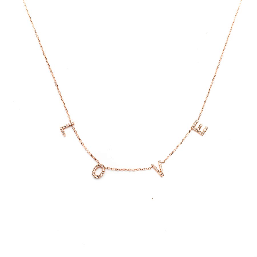 18kt gold and pave diamond LOVE necklace. Choose rose or white gold.