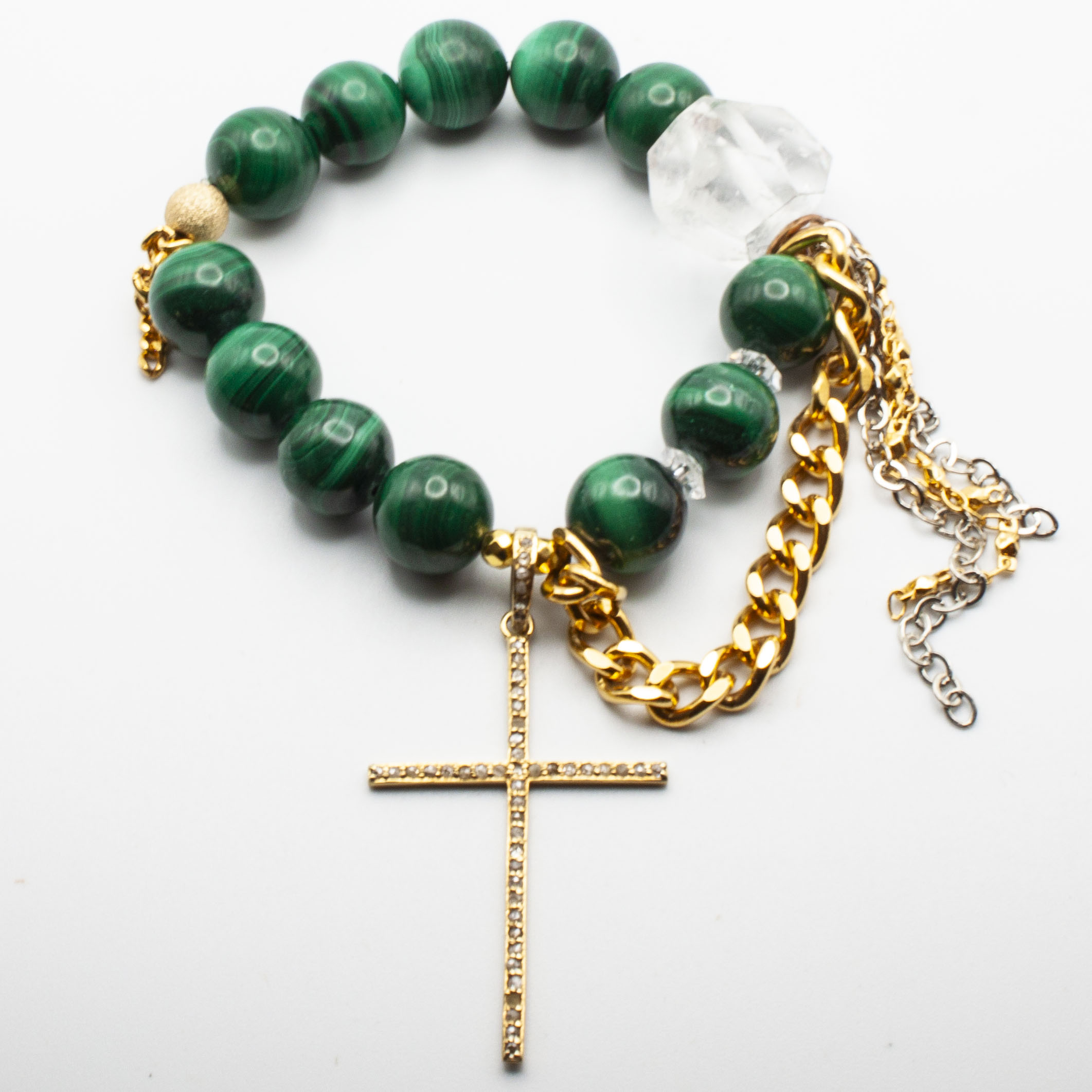 Malachite with a diamond cross pendant. 18kt gold stardust accent bead and gold rhodium chain and tasseling. 12mm 7″ stretch bracelet.