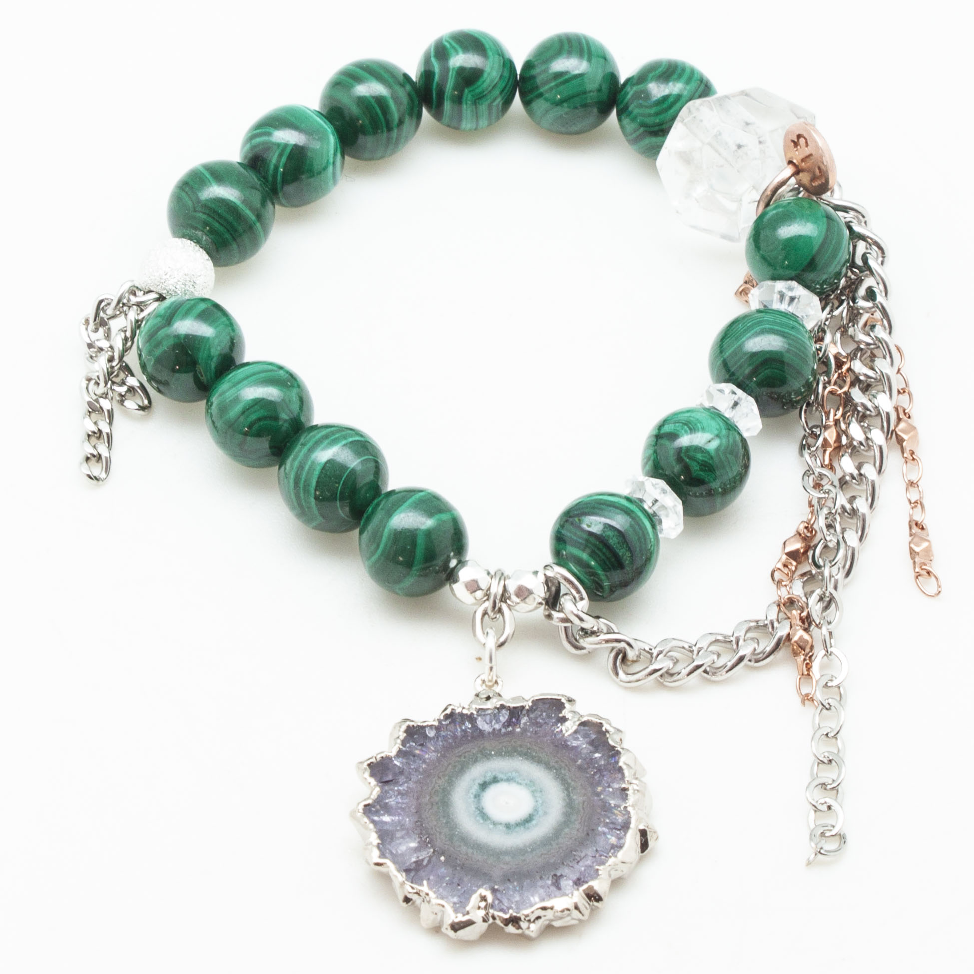 Malachite with a sterling silver wrapped solar quartz crystal pendant. Sterling silver stardust accent bead and silver rhodium chain and tasseling. Quartz crystal accents. 12mm 7 inch stretch bracelet.