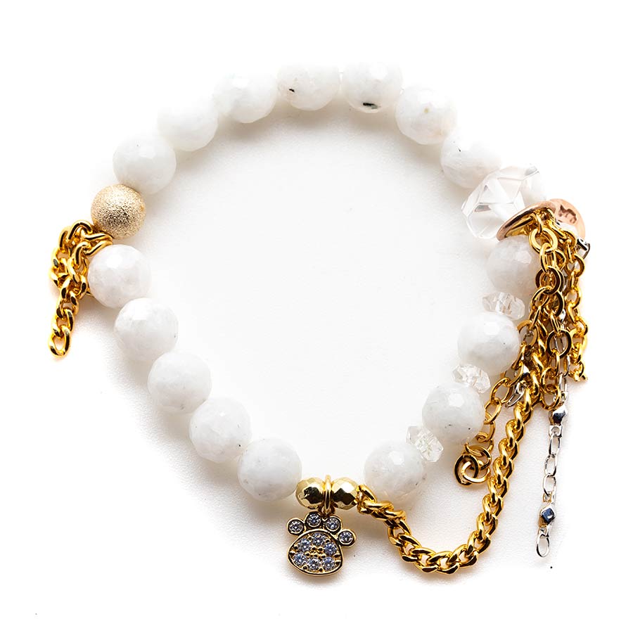 Faceted white moonstone with a crystal puppy paw charm. 18kt gold stardust accent bead and gold rhodium chain and tasseling.