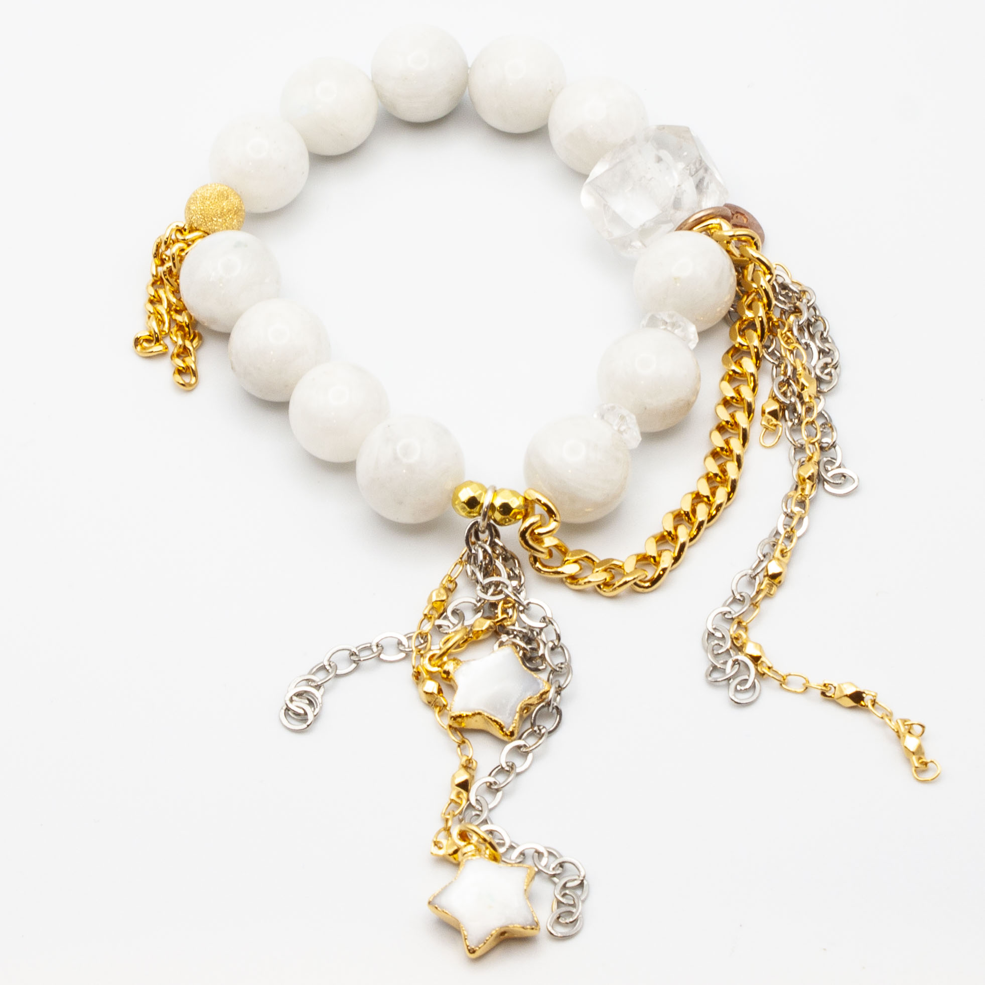 Moonstone with 18kt gold plate wrapped abalone stars. 18kt gold stardust accent bead and gold rhodium chain and tasseling. Quartz crystal accents. 12mm bead. 7 inch stretch bracelet.