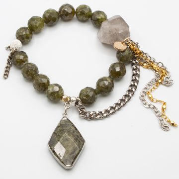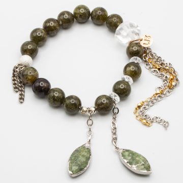 New beginnings are an opportunity to grow and expand. Be supported during these exciting times with a set of crystals that is to support you in living your biggest and best life, that celebrates the body and welcomes vitality and strenth. With this stack upon your arm you will be able to operate fully from your heart center. A set of 3 green garnet bracelets with various crystal pendants. 10mm faceted & smooth beads. 7 inch stretch bracelets.