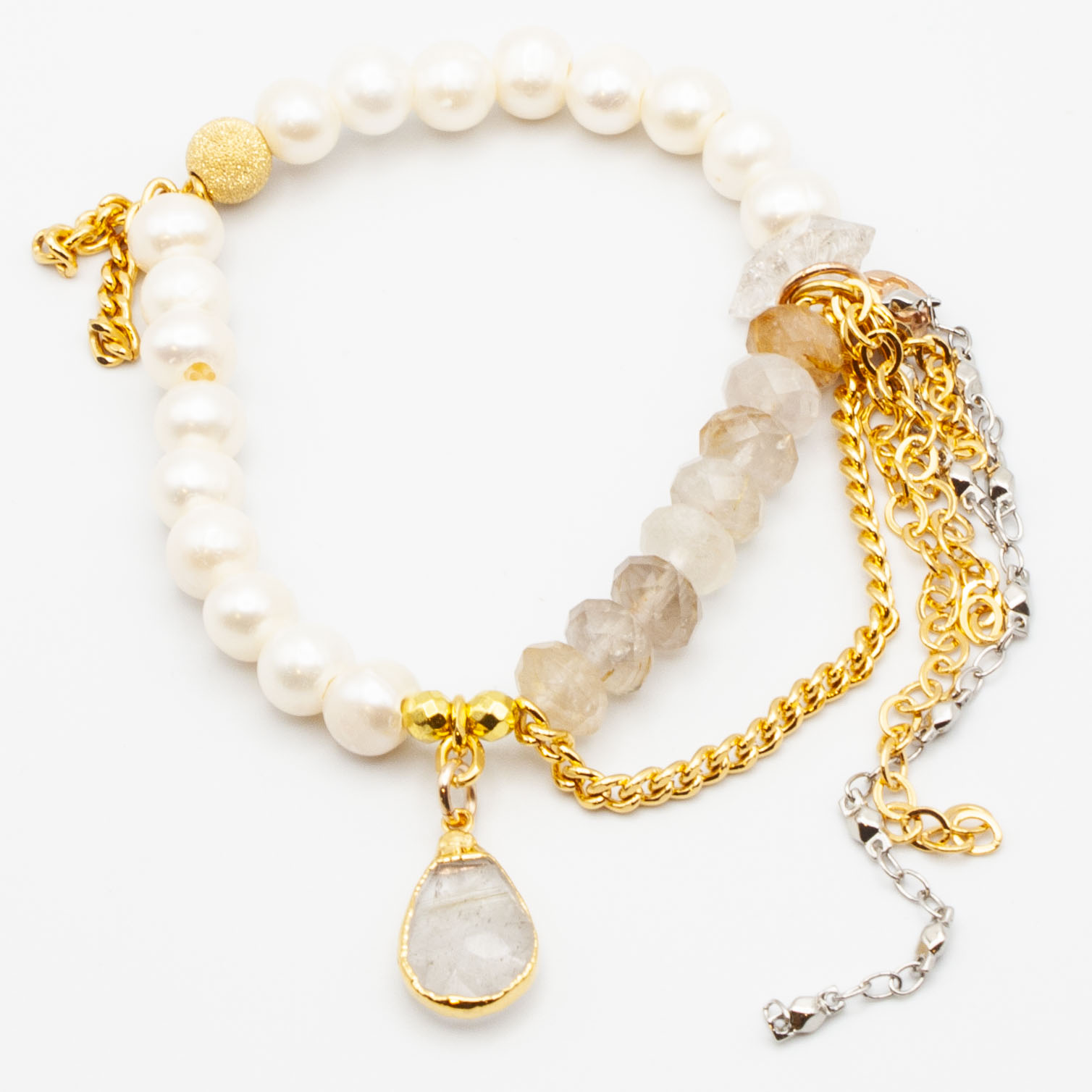 Pearls & golden rutilated quartz with a 18kt gold plate wrapped golden rutilated quartz crystal pendant. 18kt gold stardust accent bead and gold rhodium chain and tasseling. 8mm bead. 7 inch stretch bracelet.