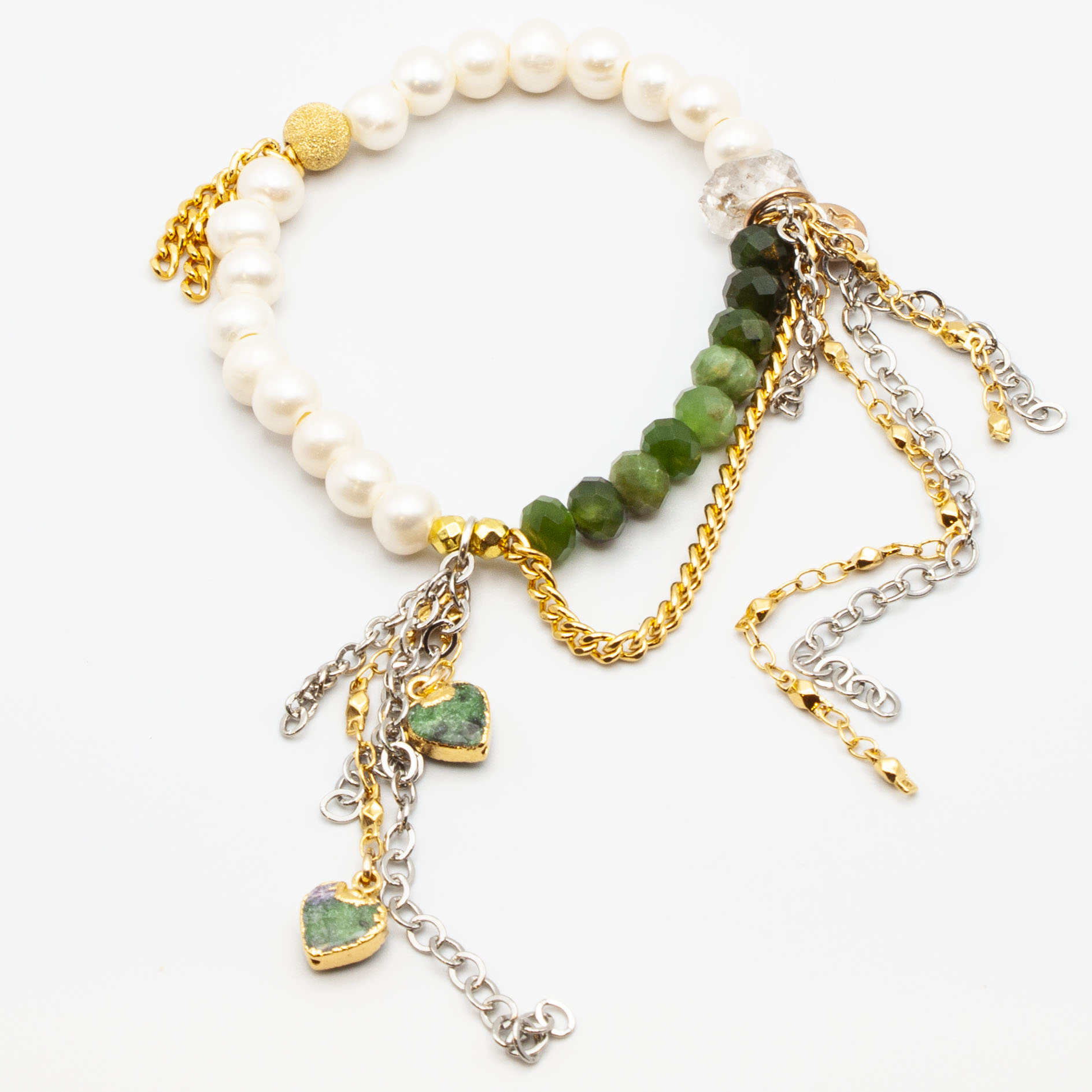 Pearls and jade with 18kt gold plate wrapped jade heart pendants. 18kt gold stardust accent bead and gold rhodium chain and tasseling. Herkimer diamond accent. 8mm bead. 7 inch stretch bracelet.