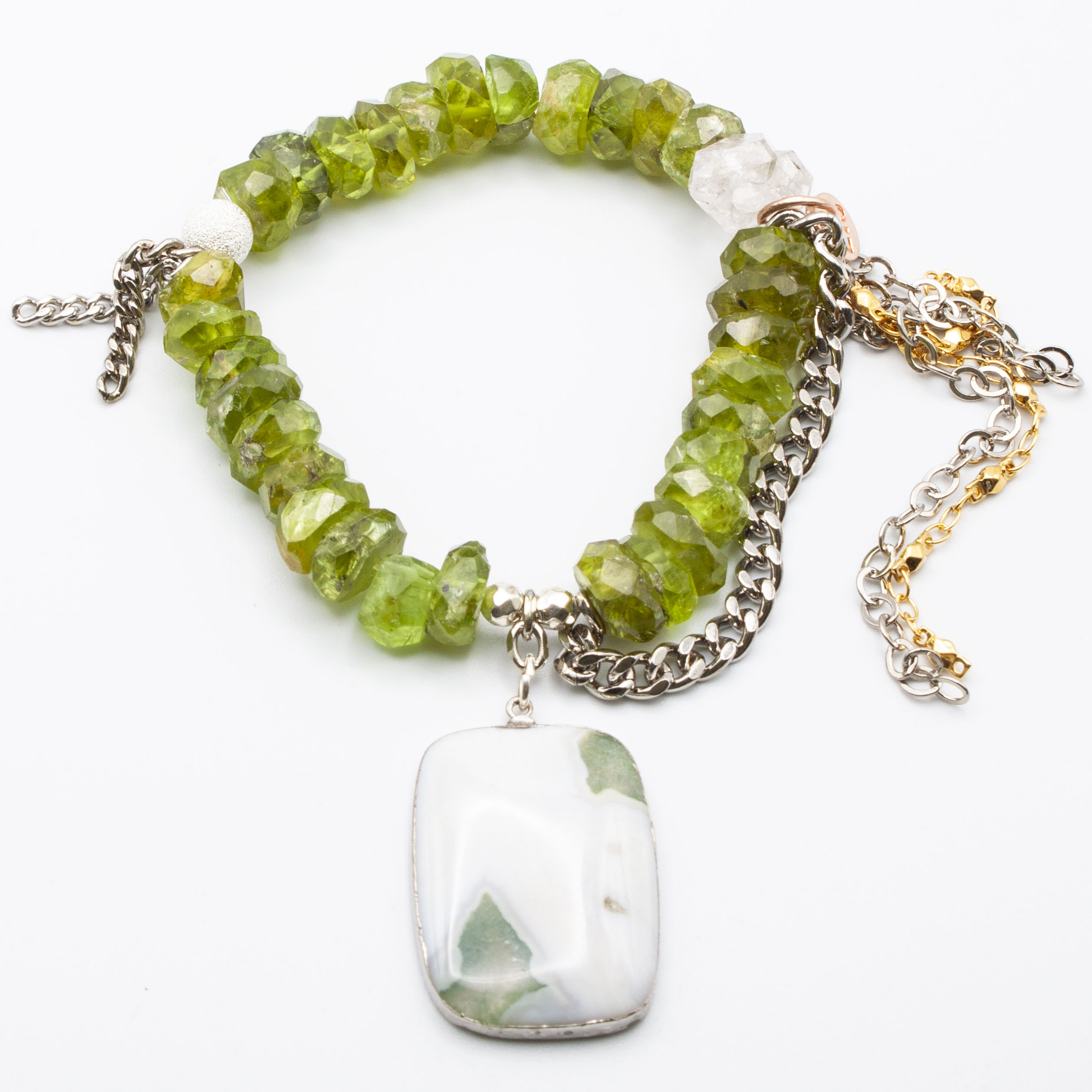 Raw peridot with a sterling silver wrapped agate pendant. Sterling silver stardust accent bead and silver rhodium chain and tasseling. 7″ stretch bracelet.