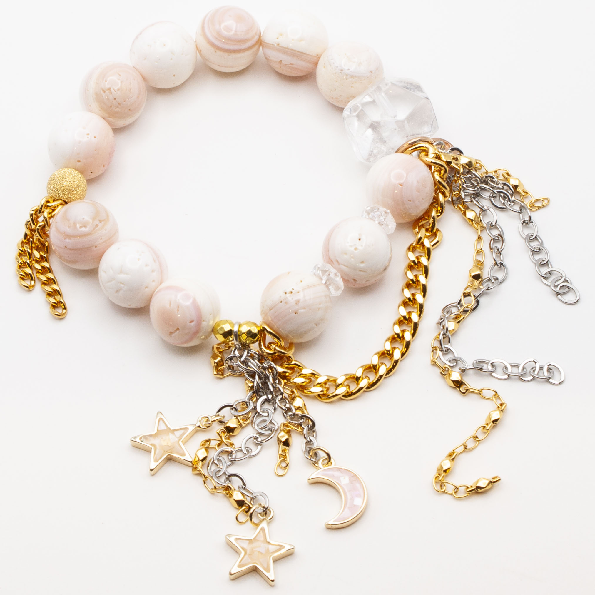 Pink abalone with an abalone moon and star waterfall. 18kt gold stardust accent bead and gold rhodium chain and tasseling. 12mm bead. 7 inch stretch bracelet.