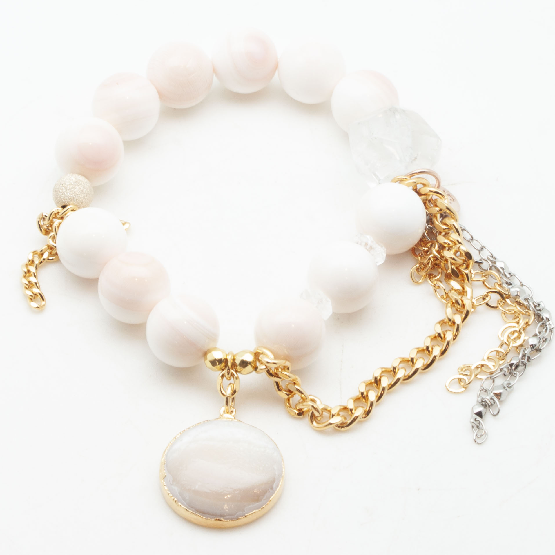 Pink abalone with a 18kt gold plate wrapped pink abalone pendant. 18kt gold stardust accent bead and gold rhodium chain and tasseling. Quartz Crystal Accents. 12mm. 7 inch stretch bracelet.
