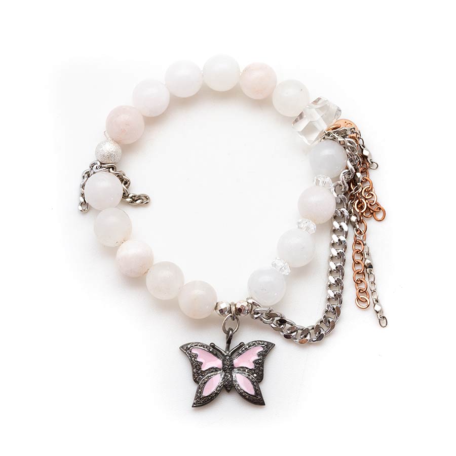 Pink calcite with a diamond butterfly pendant. Sterling silver stardust accent bead and silver rhodium chain and tasseling. 10mm 7″ stretch bracelet.