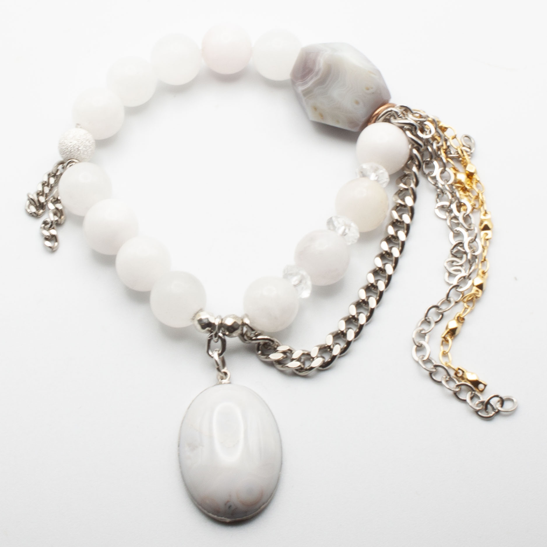 Pink calcite with a sterling silver wrapped agate pendant. Sterling silver stardust accent bead and silver rhodium chain and tasseling. 10mm 7″ stretch bracelet.