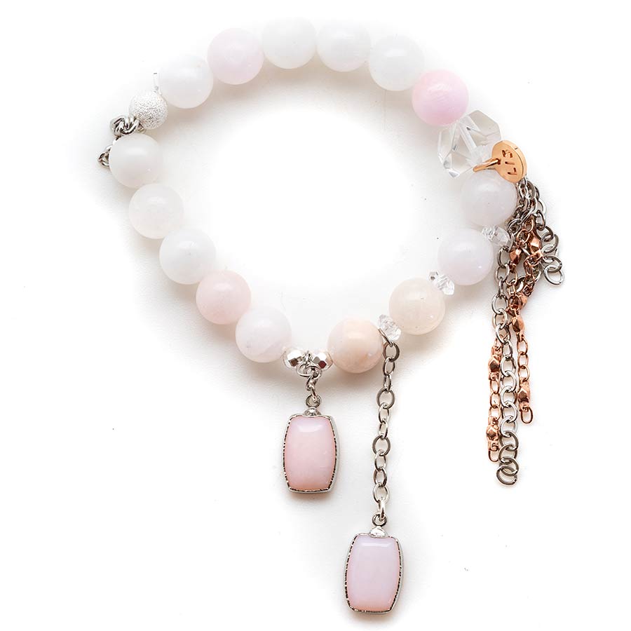 Pink calcite with sterling silver wrapped pink calcite pendants. Sterling silver stardust accent bead and silver rhodium chain and tasseling. Quartz crystal accents. 7 inch stretch bracelet.