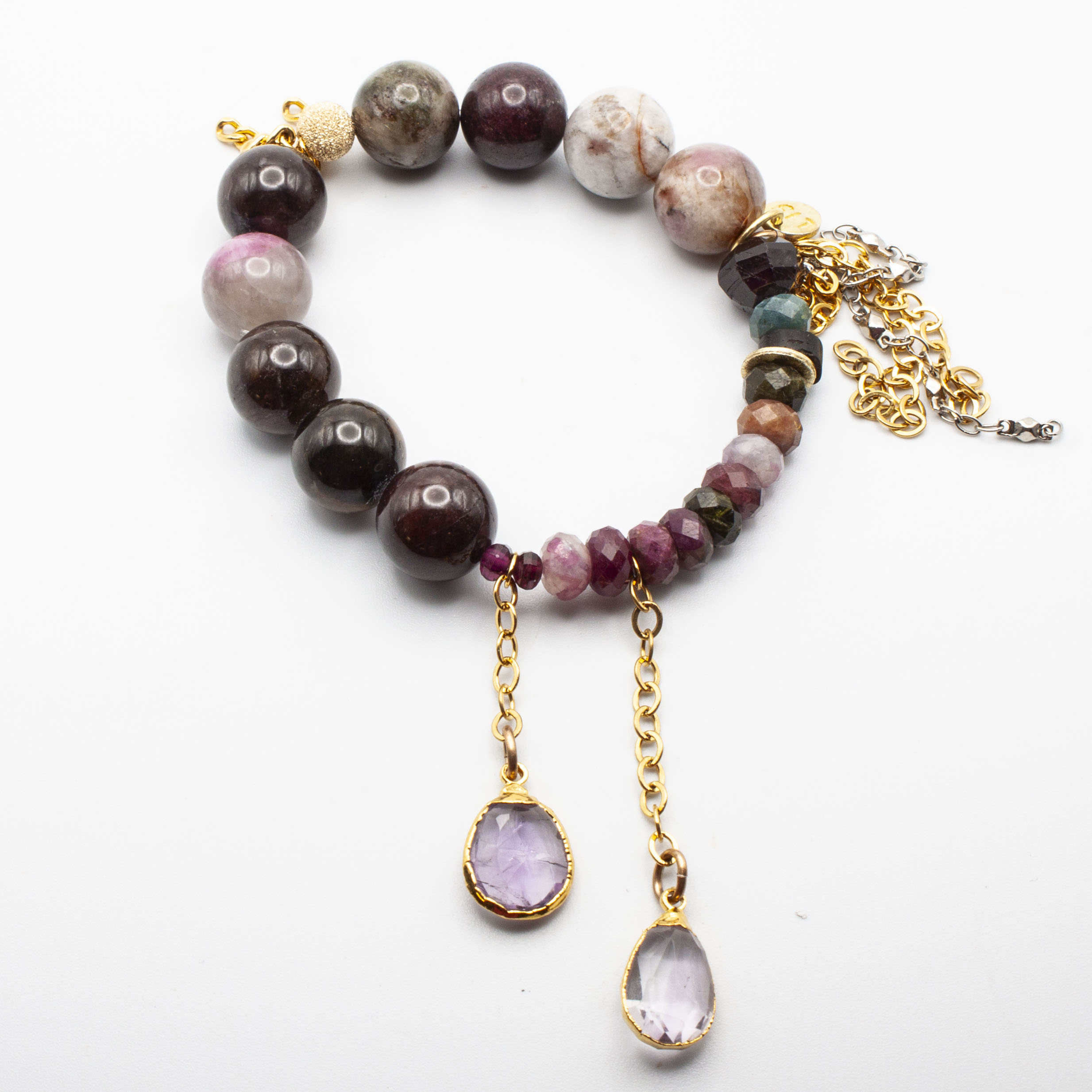 Pink tourmaline with 18kt gold plate wrapped amethyst pendants. 18kt gold stardust accent bead and gold rhodium tasseling. 12mm 7″ stretch bracelet.