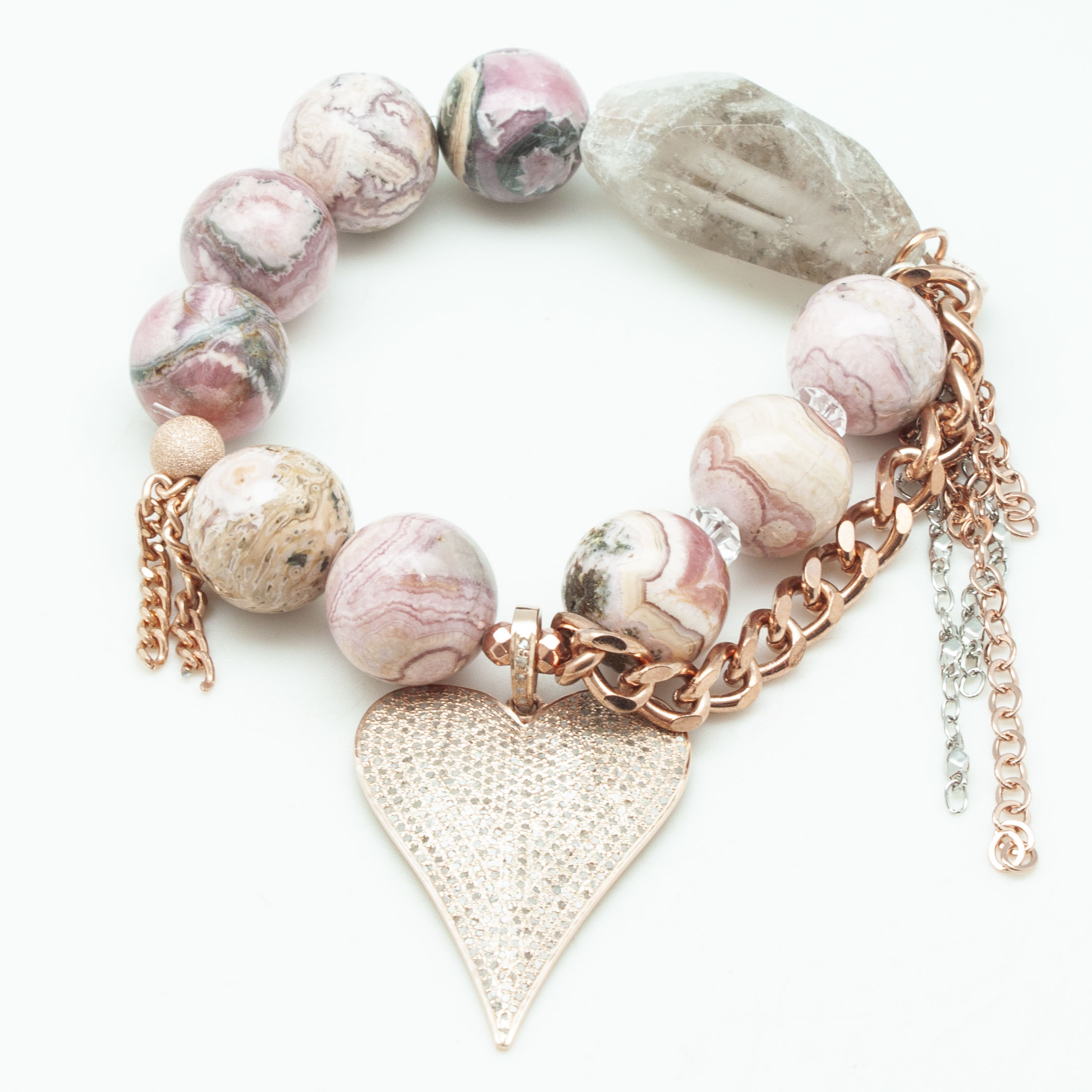 Rhodocrosite with a diamond heart. 18kt rose gold stardust accent bead and rose gold rhodium chain and tasseling. 16mm 7 inch stretch bracelets.