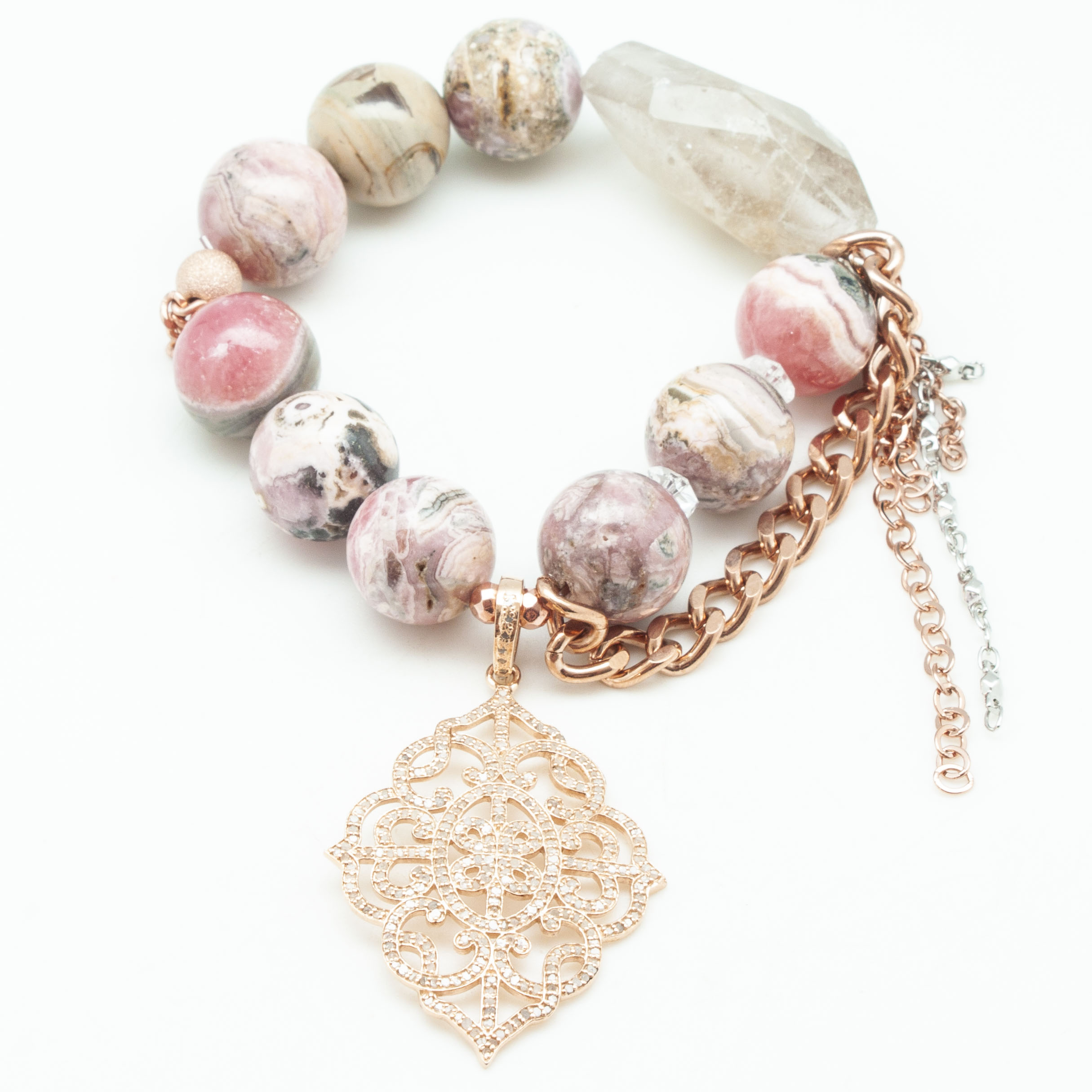 Rhodocrosite with a diamond pendant. 18kt rose gold stardust accent bead and rose gold rhodium chain and tasseling. 16mm 7 inch stretch bracelets.