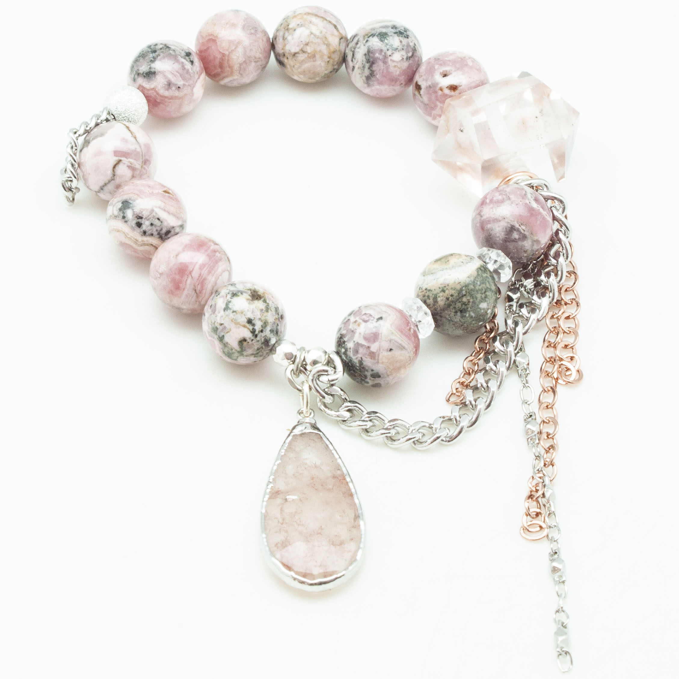 Rhodocrosite with a sterling silver wrapped strawberry quartz crystal pendant. Sterling silver stardust accent bead and silver rhodium chain and tasseling. 7 inch stretch bracelets.