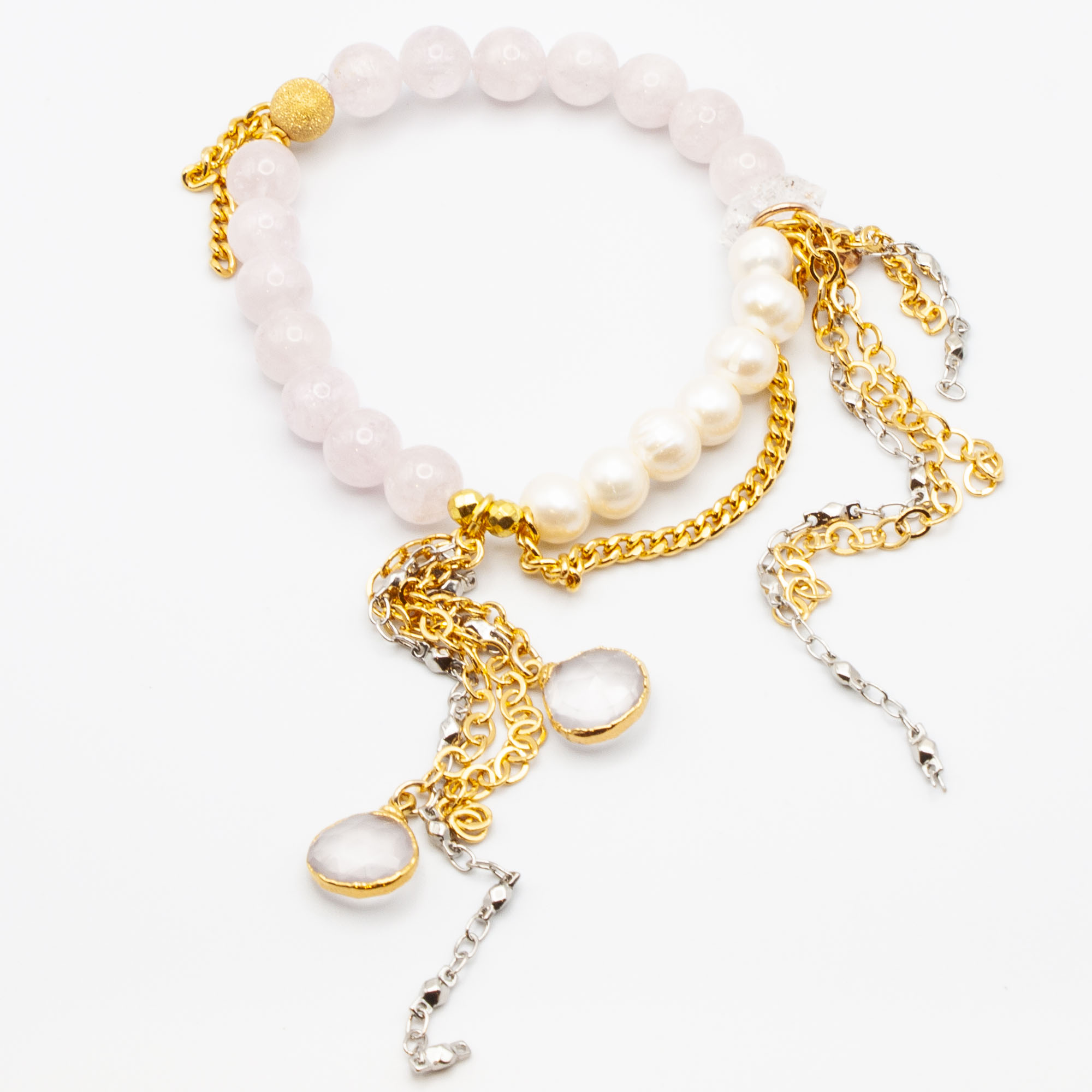 Rose quartz and pearls with a 18kt gold plate wrapped rose quartz pendants. 18kt gold stardust accent bead and gold rhodium chain and tasseling. 8mm bead. 7 inch stretch bracelet.