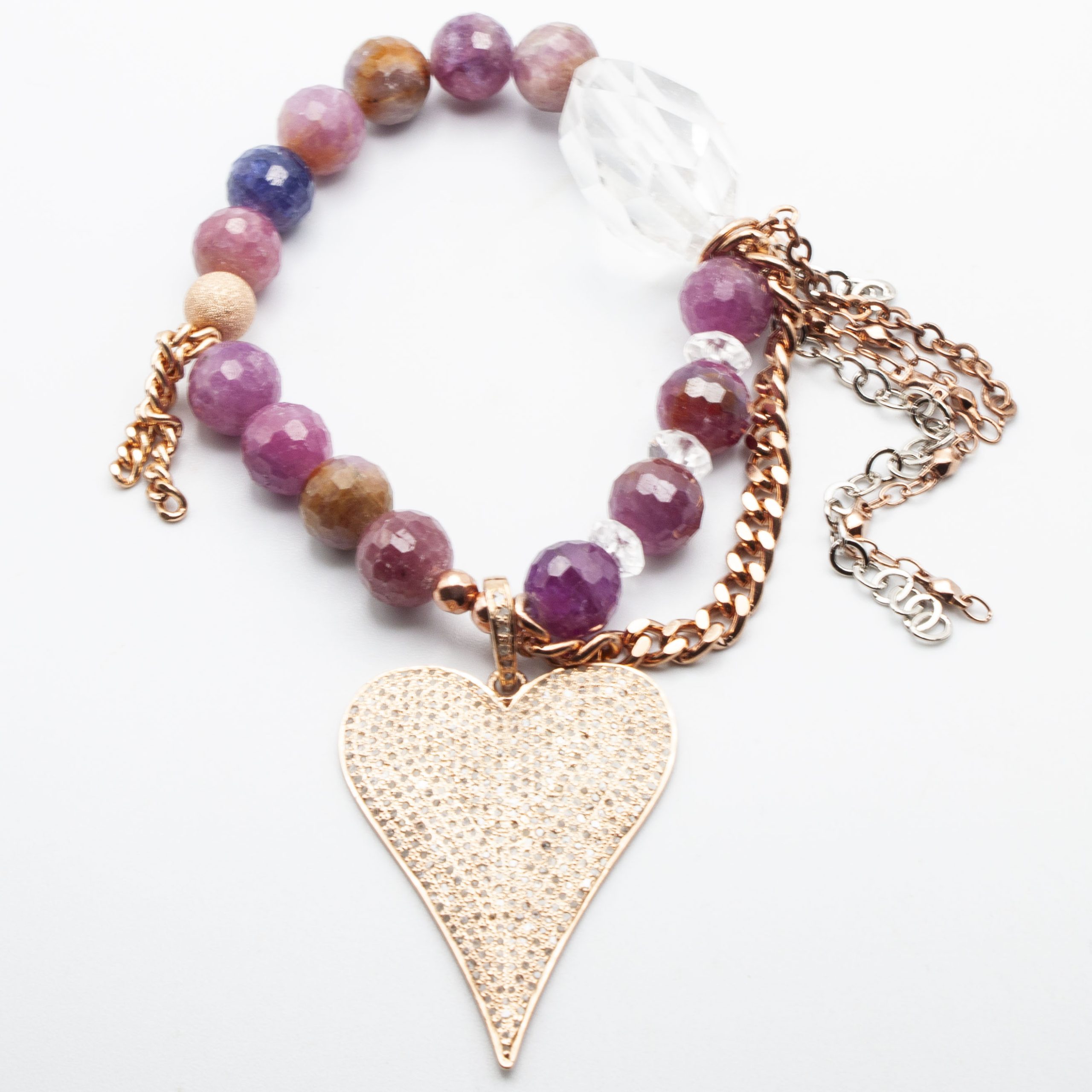 Raw rubies with a diamond heart pendant. 18kt rose gold stardust accent bead and rose gold rhodium chain and tasseling. 10mm 7″ stretch bracelet.