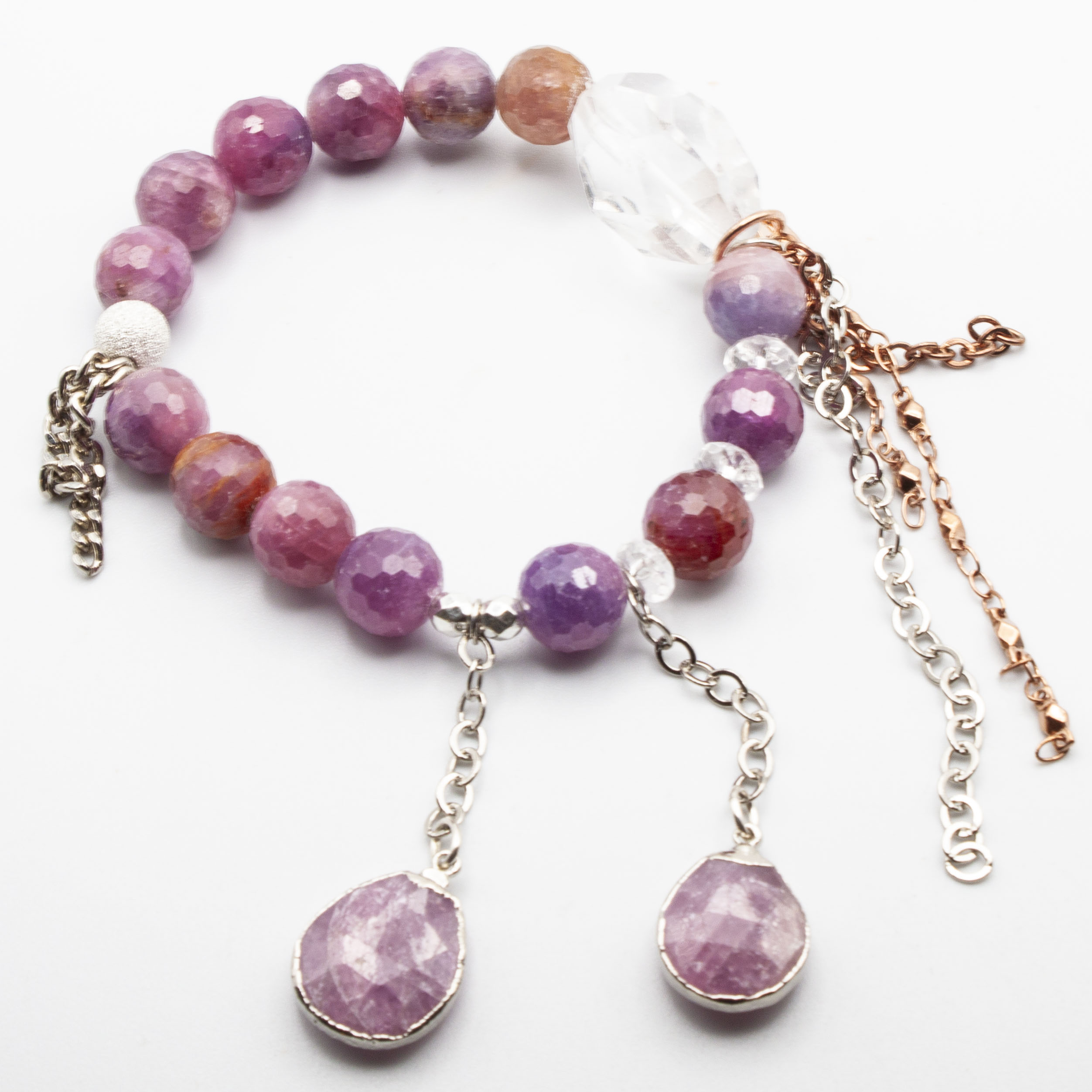 Raw rubies with sterling silver wrapped ruby pendants. Sterling silver stardust accent bead and silver tasseling. 10mm 7″ stretch bracelet.