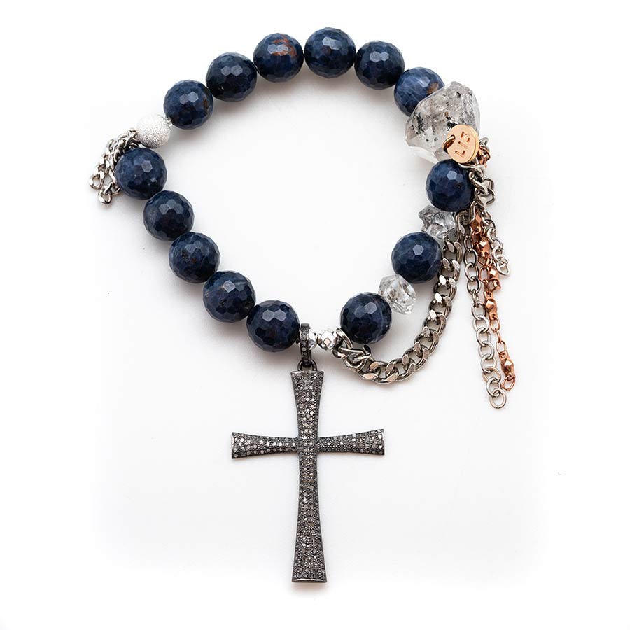 Sapphires with a diamond cross pendant. 18kt gold stardust accent bead and gold rhodium chain and tasseling. 12mm 7″ stretch bracelet.