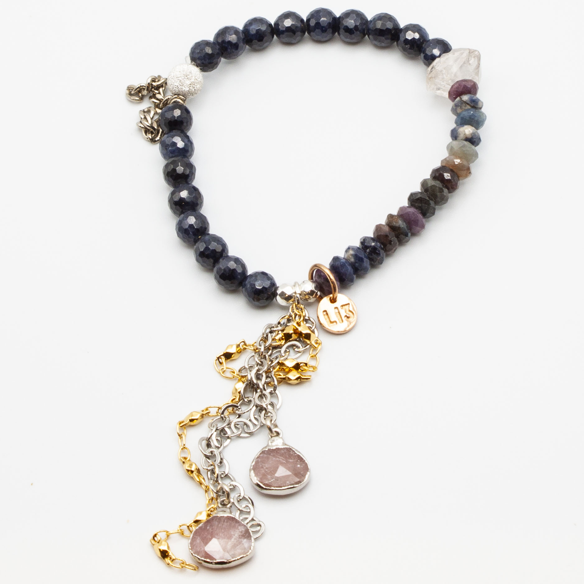Faceted raw blue and multi-colored sapphires with sterling silver wrapped pink sapphire pendants. Sterling silver stardust accent bead and silver rhodium tasseling. Herkimer diamond accent. 6mm beads. 7 inch stretch bracelet.