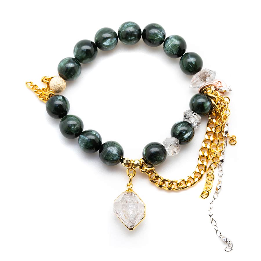 Seraphinite with a 18kt gold plate wrapped Herkimer diamond pendant. 18kt gold stardust accent bead and gold rhodium chain and tasseling. Herkimer diamond accents. 10mm bead. 7″ stretch bracelet.