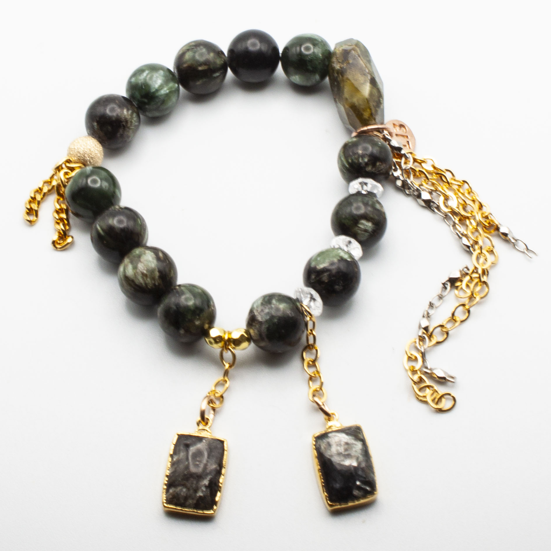 Seraphinite with 18kt gold plate wrapped seraphinite pendants. 18kt gold stardust accent bead and gold rhodium tasseling. 7″ stretch bracelet.