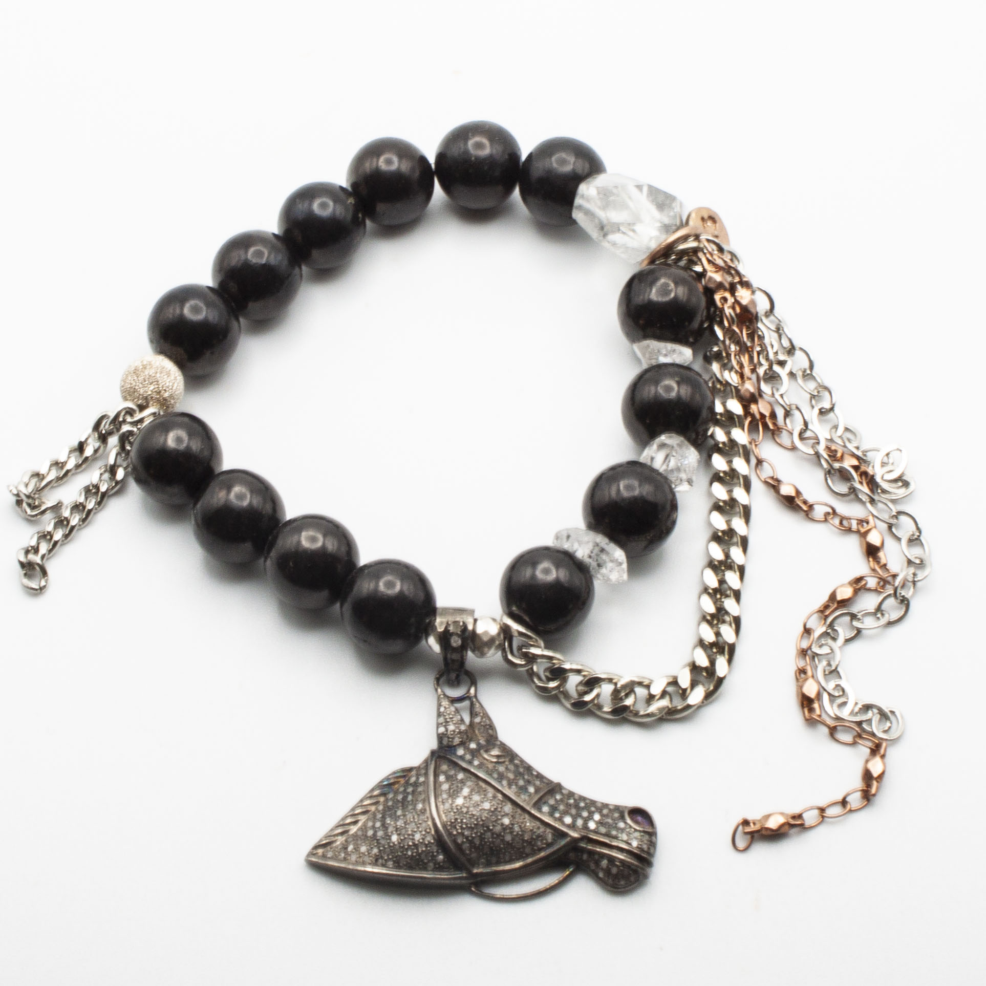 Shungite with a diamond horse. Sterling silver stardust accent bead and silver rhodium chain and tasseling. 10mm 7″ stretch bracelet.