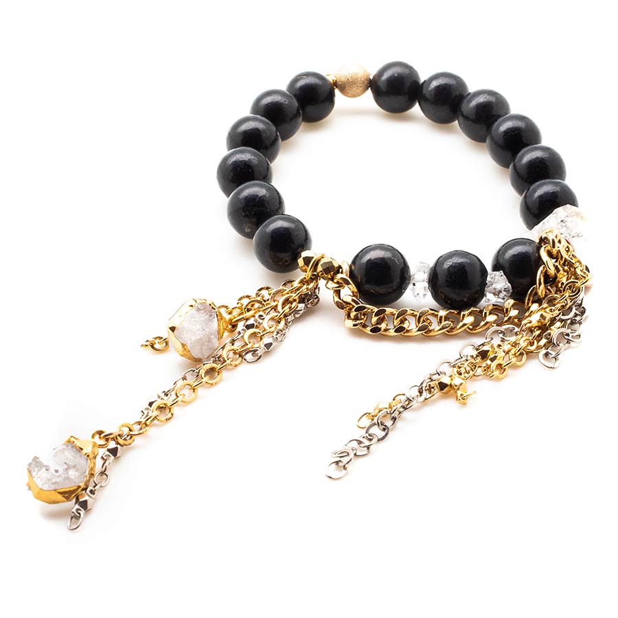Shungite with 18kt gold plate wrapped herkimer diamonds. 18kt gold stardust accent bead and gold rhodium chain and tasseling. Herkimer diamond accents. 7 inch stretch bracelet.
