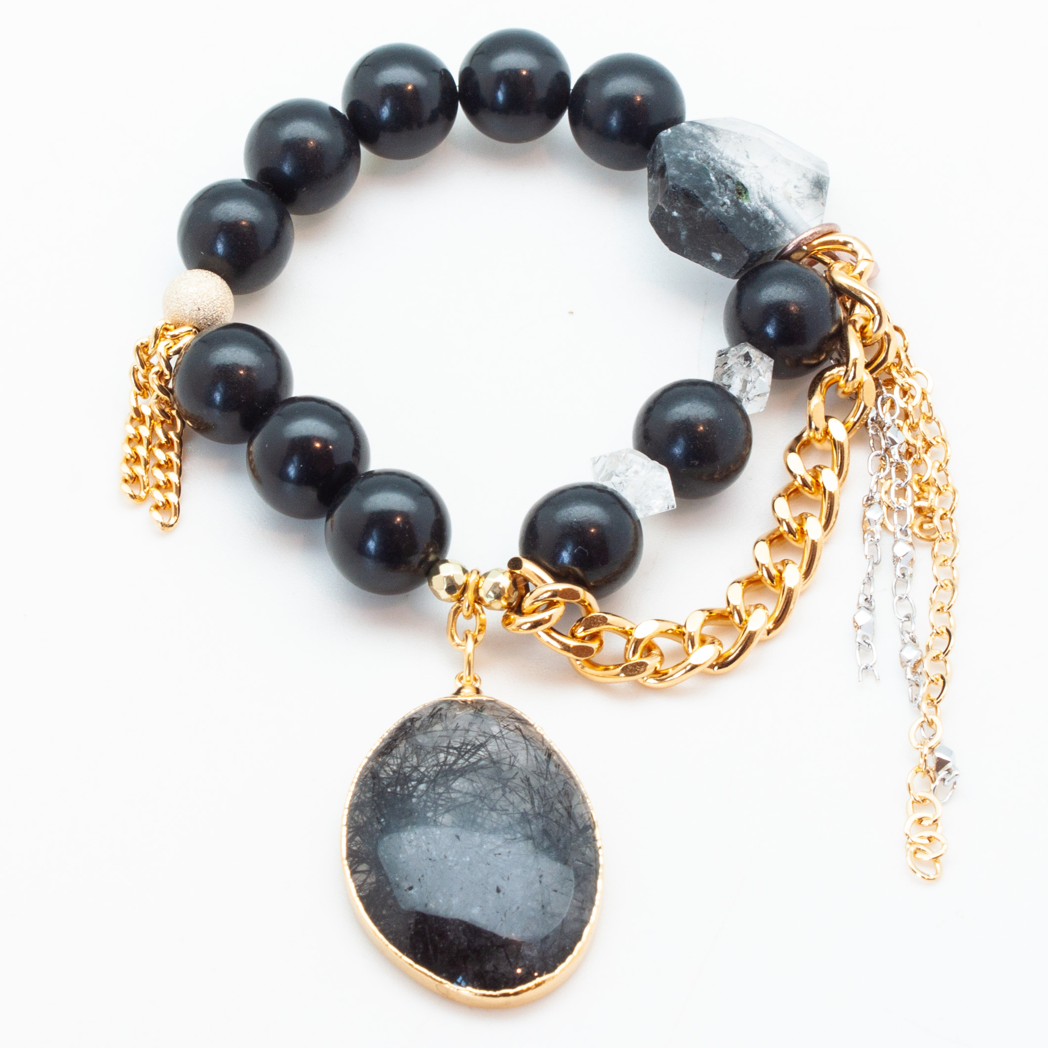 Shungite with a 18kt gold plate wrapped tourmalinated quartz crystal pendant. 18kt gold stardust accent bead and gold rhodium chain and tasseling. 12mm – 7″ stretch bracelet.
