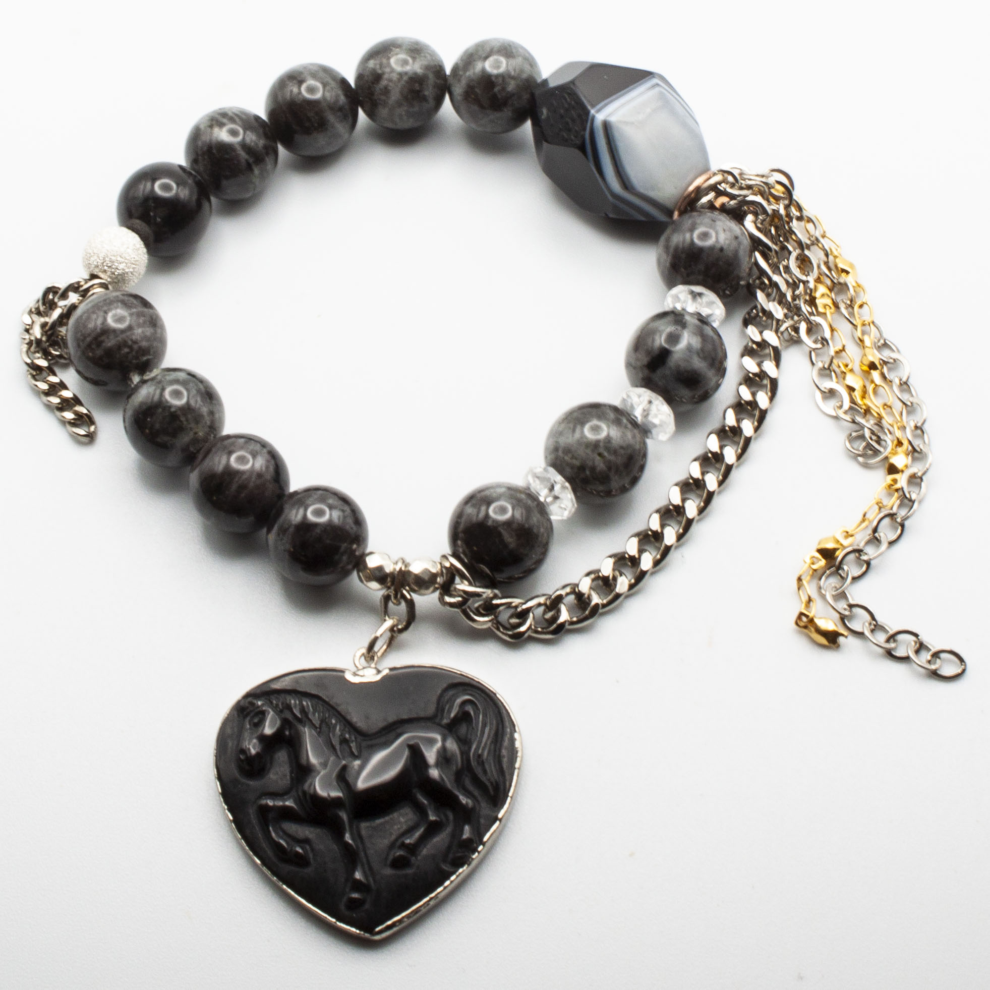 Silver hypersthene with a sterling silver wrapped hand-carved obsidian horse pendant. Sterling silver stardust accent bead and silver rhodium chain and tasseling. 10mm 7″ stretch bracelet.