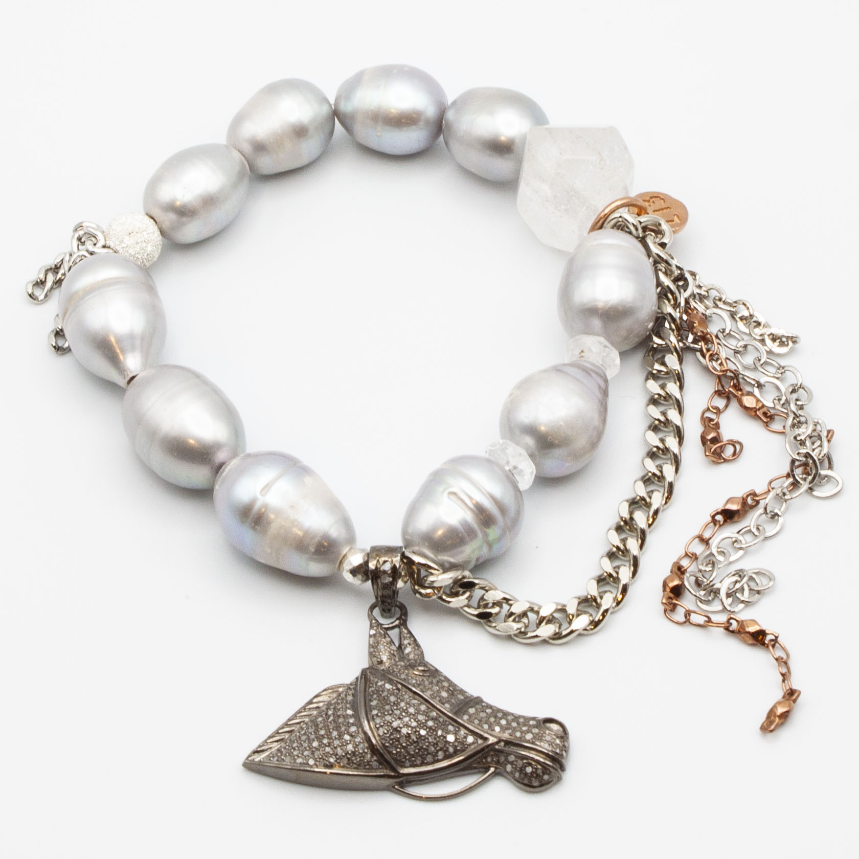 Silver pearls with a diamond horse pendant. Sterling silver stardust accent bead and silver rhodium chain and tasseling. Quartz crystal accents. 7 inch stretch bracelet.
