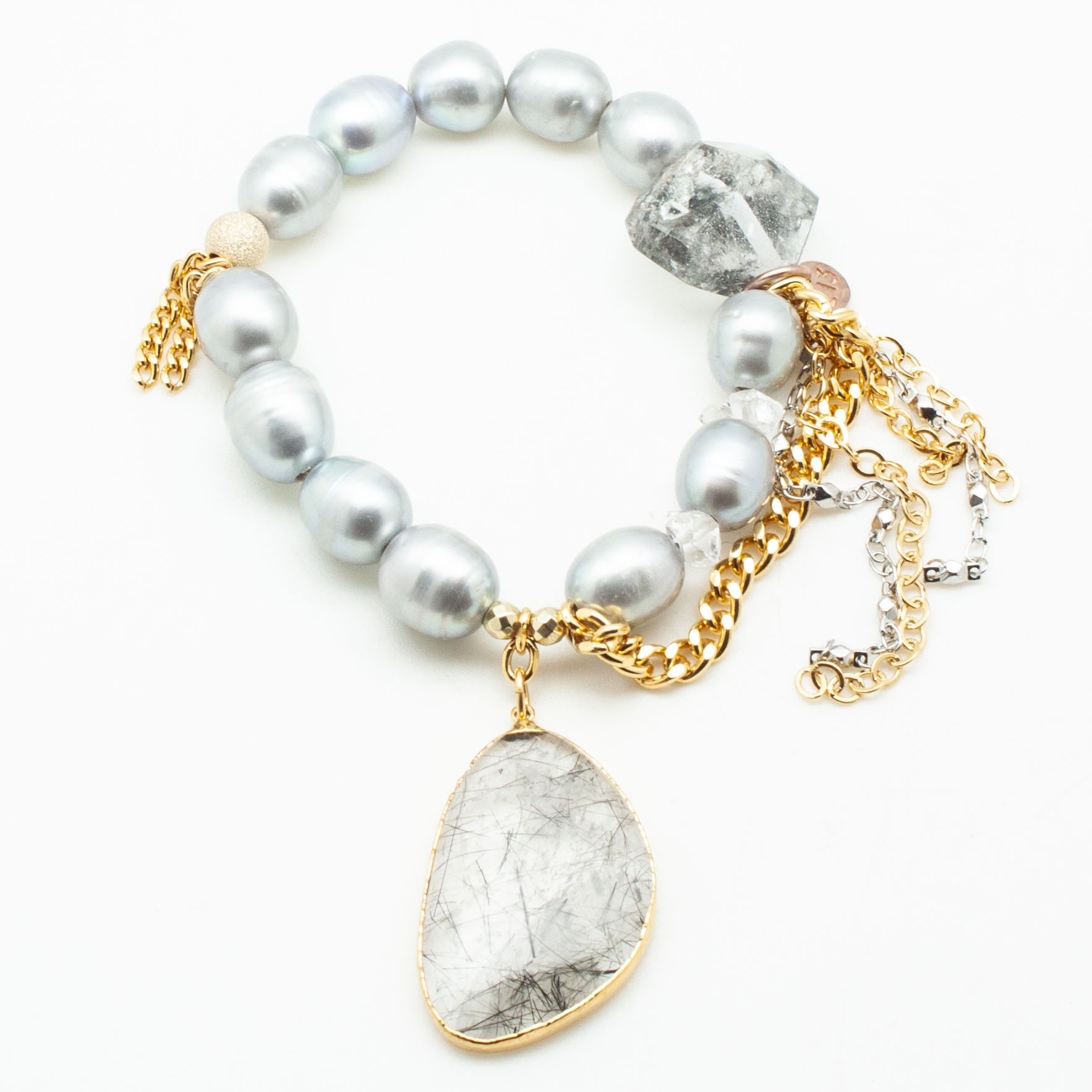 Silver goddess pearls with a 18kt gold plate wrapped tourmalinated quartz crystal pendant. 18kt gold stardust accent bead and gold rhodium chain and tasseling. Herkimer diamond accents. 7″ stretch bracelet.
