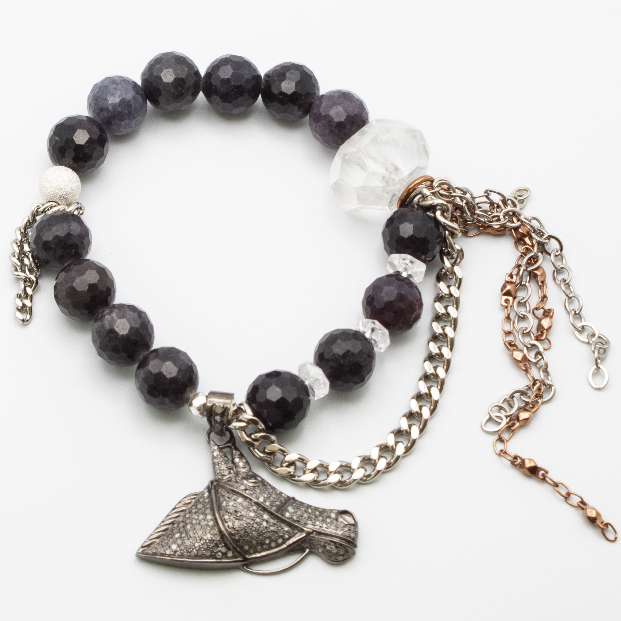 Faceted silver tourmaline with a diamond horse pendant. Sterling silver stardust accent bead and silver rhodium chain and tasseling. Quartz crystal accents. 10mm 7 inch stretch bracelet.