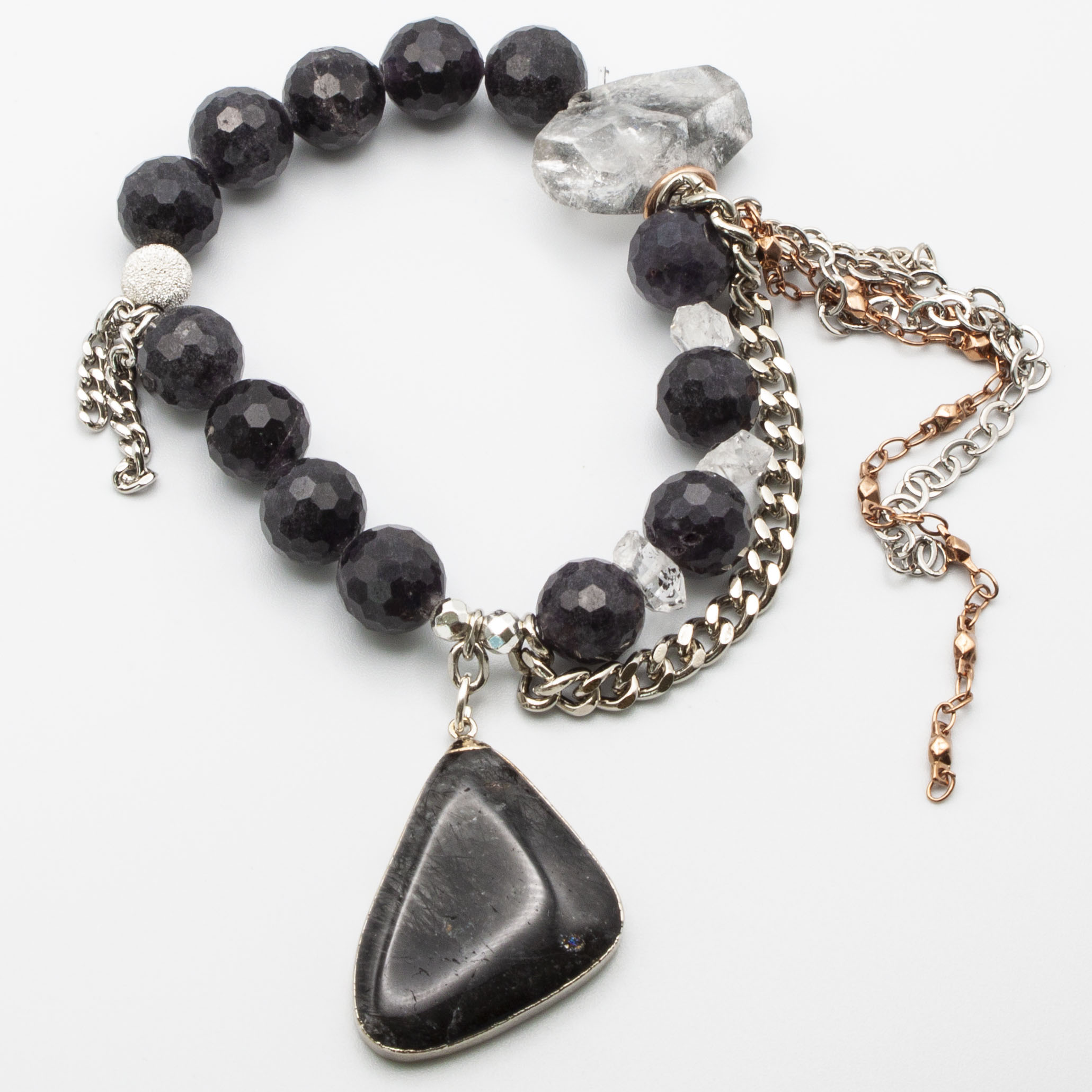 Faceted silver tourmaline with a sterling silver wrapped tourmalinated quartz crystal pendant. Sterling silver stardust accent bead and silver rhodium chain and tasseling. Herkimer Diamond accents. 10mm 7 inch stretch bracelet.
