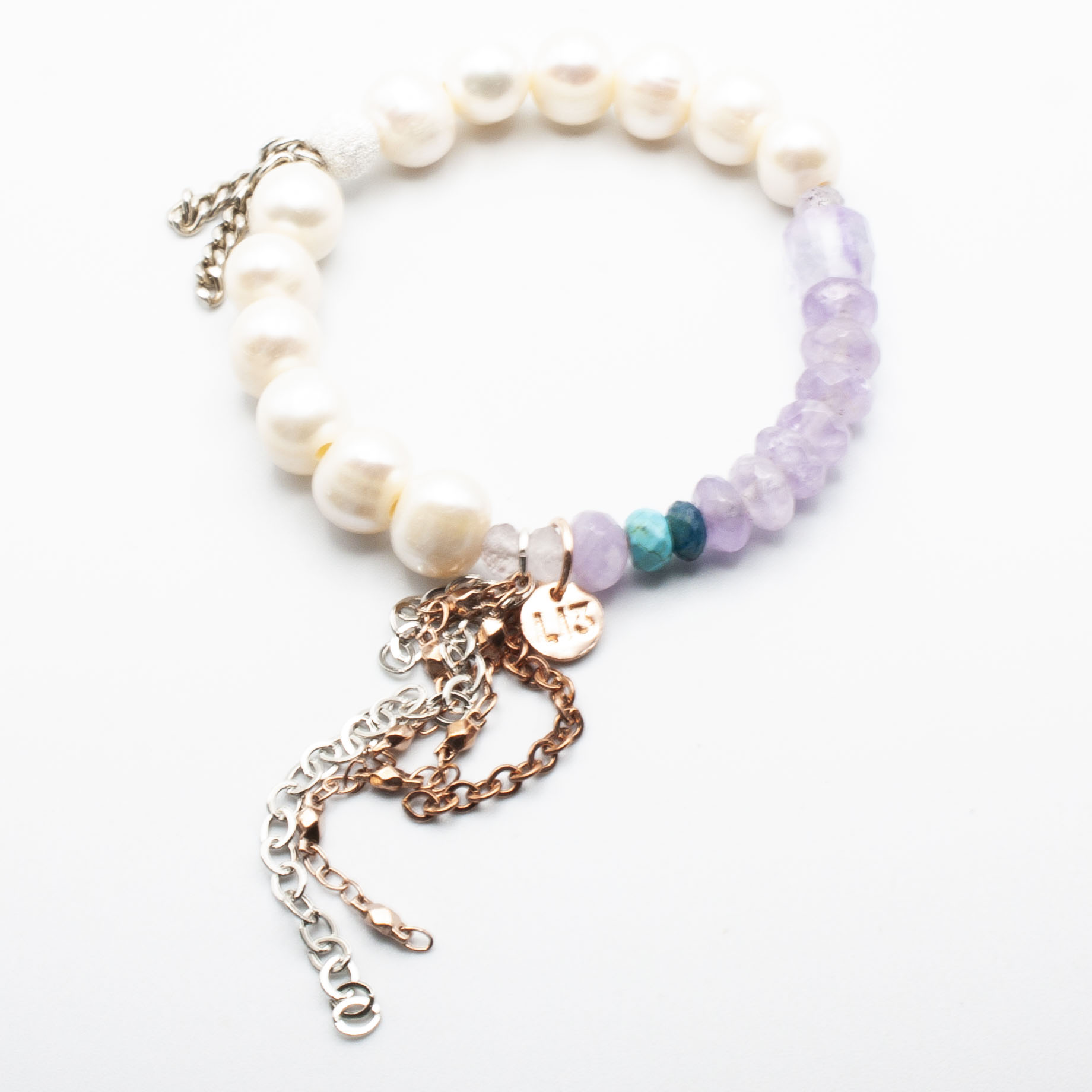 Pearls adorned with amethyst, turquoise and apatite. Sterling silver stardust accent bead and rhodium tasseling. 7″ stretch bracelet.