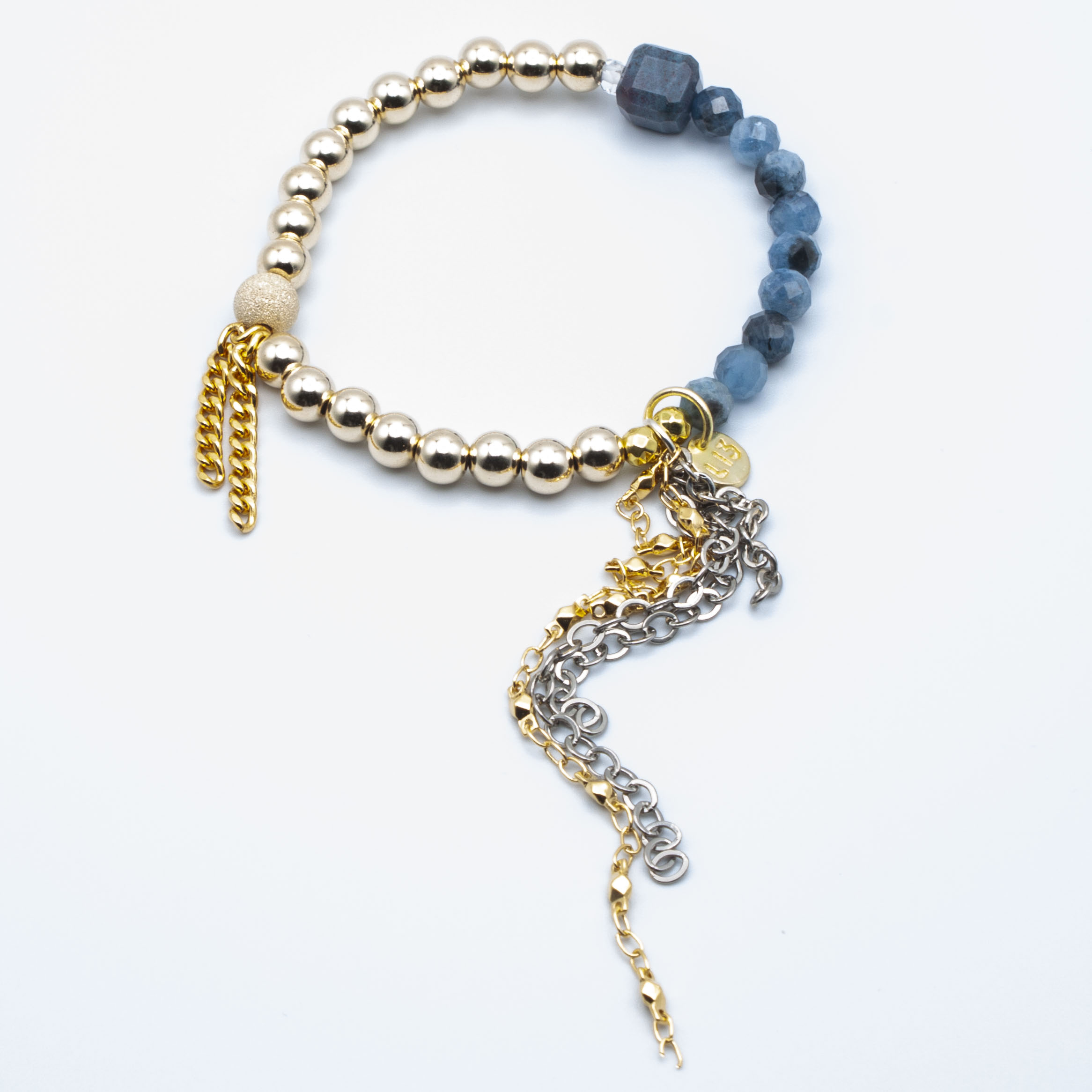 Created & Blessed to cleanse and clear your throat chakra. May you be divinely blessed to speak with courage, yet full of compassion and kindness. 18kt gold 7 inch stretch bracelet.