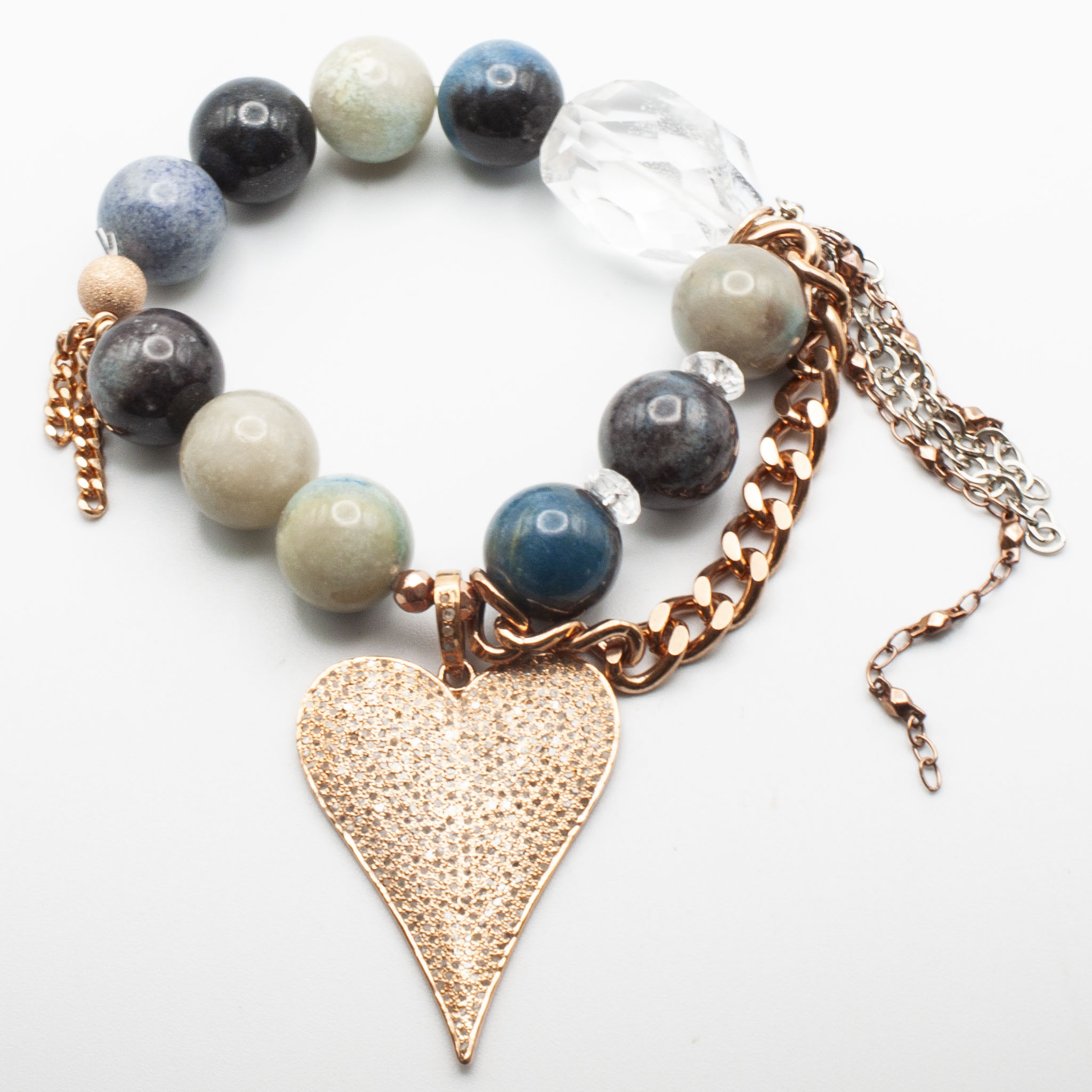 Trolleite with a diamond heart pendant. Rose gold stardust accent bead and rose gold rhodium chain and tasseling. 13mm 7″ stretch bracelet.
