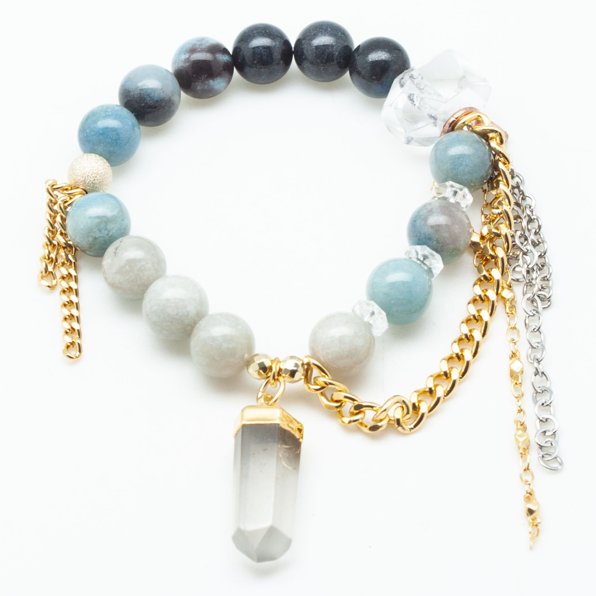 Trolleite with a 18kt gold plate wrapped quartz crystal pendant. 18kt gold stardust accent bead and gold rhodium chain and tasseling. Quartz crystal accents. 10mm 7 inch stretch bracelet.