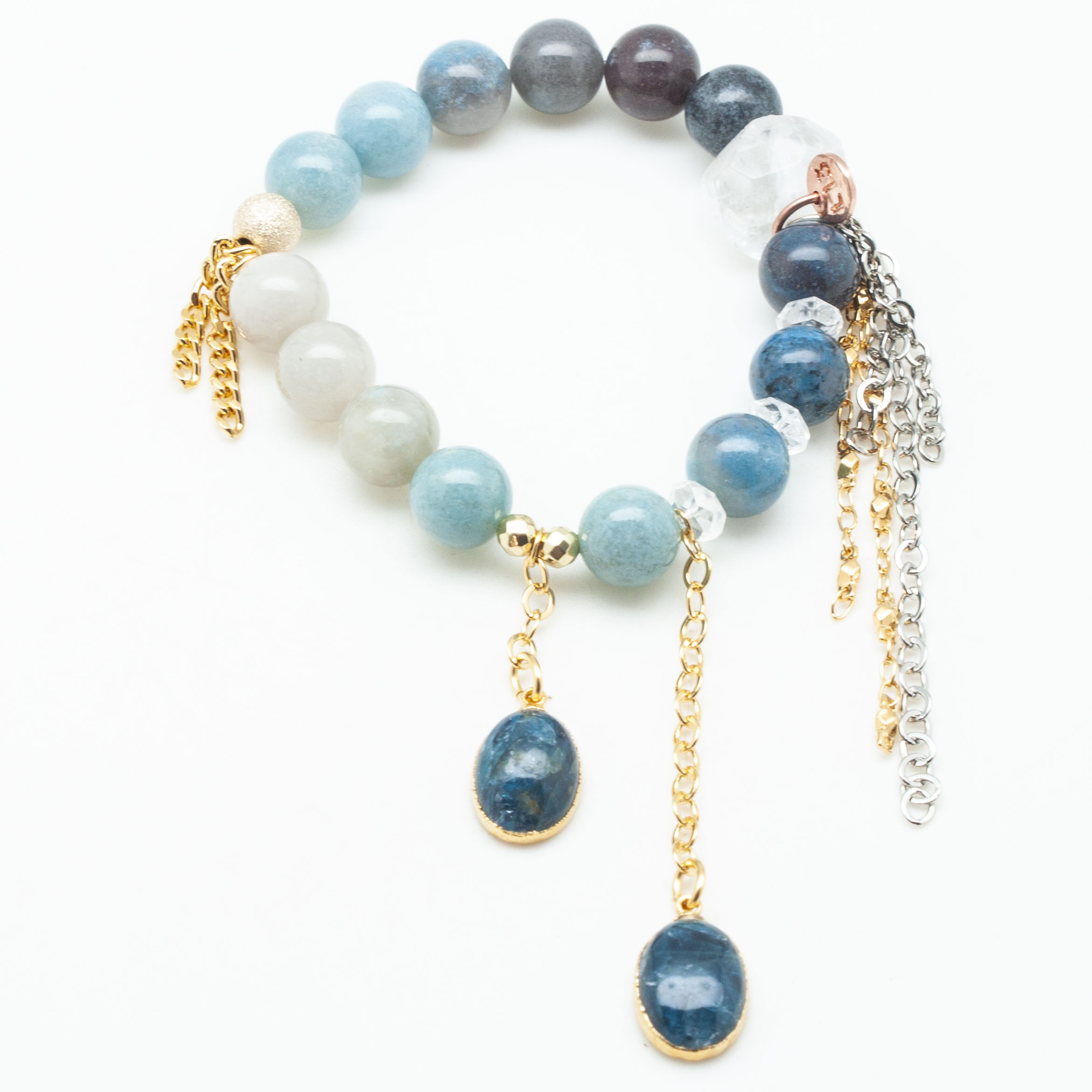 Trolleite with 18kt gold plate wrapped amazonite pendants. 18kt gold stardust accent bead and gold rhodium chain and tasseling. Quartz crystal accents. 10mm 7 inch stretch bracelet.