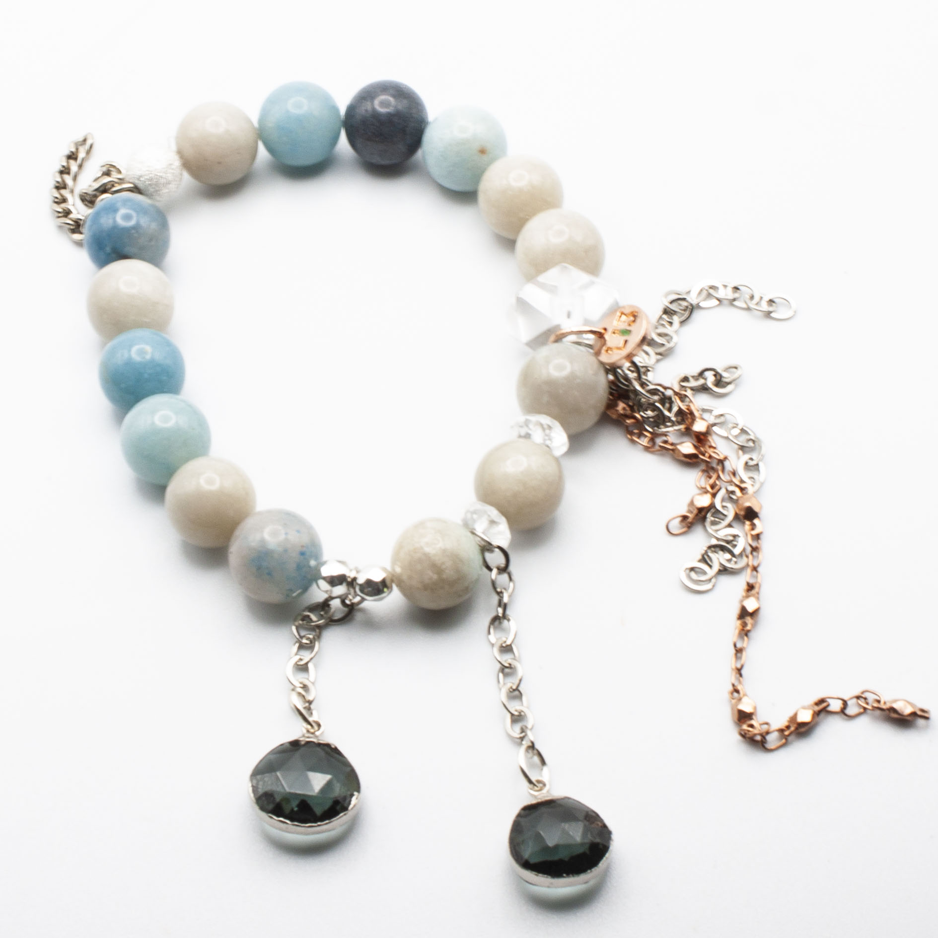 Trolleite with sterling silver wrapped apatite pendants. Sterling silver stardust accent bead and silver rhodium tasseling. Quartz accents. 10mm. 7″ stretch bracelet.