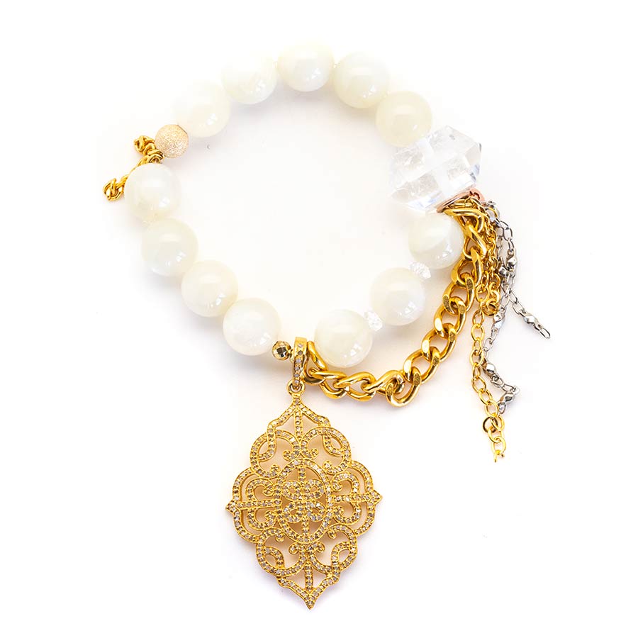 White Boss Babe moonstone with a diamond pendant. 18kt gold stardust accent bead and gold rhodium chain and tasseling. Quartz crystal accents. 12mm 7″ stretch bracelet.