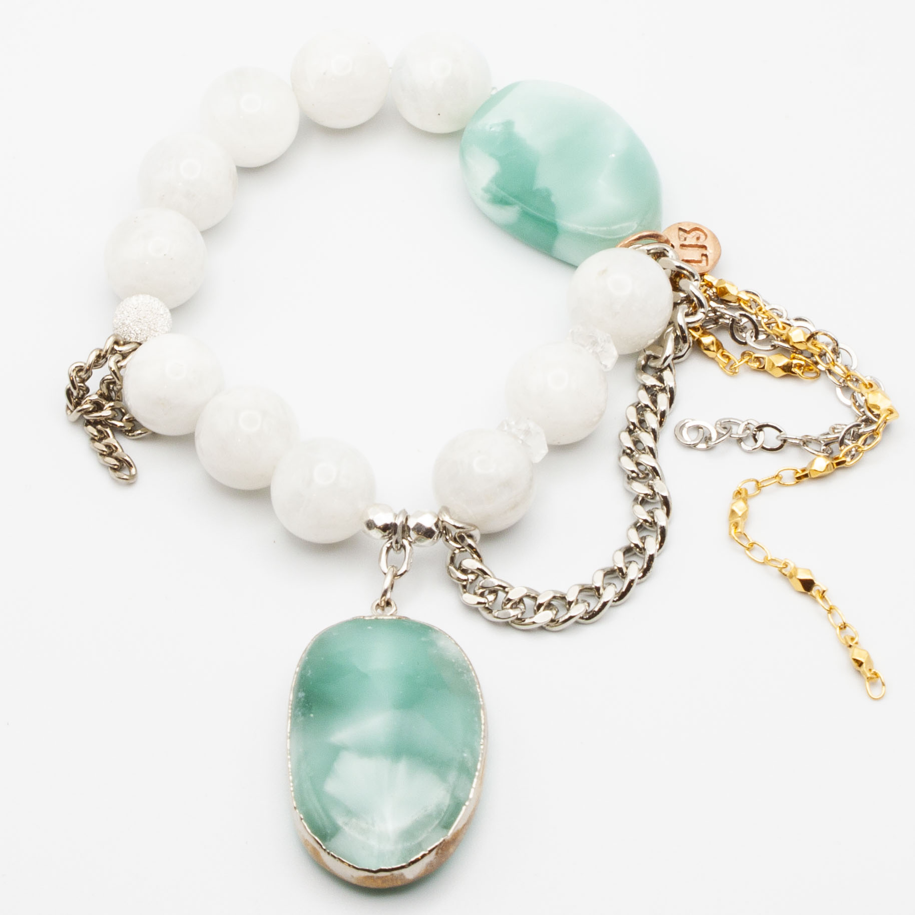 White moonstone with a sterling silver wrapped green moonstone pendant. Sterling silver stardust accent bead and silver rhodium chain and tasseling. 12mm bead. 7 inch stretch bracelet.