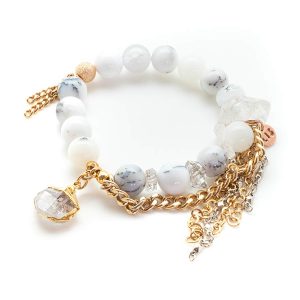 White Opals with an 18kt gold plate wrapped herkimer diamond pendant. 18kt gold stardust accent bead and gold rhodium chain and tasseling. Herkimer diamond accents. 7 inch stretch bracelet.