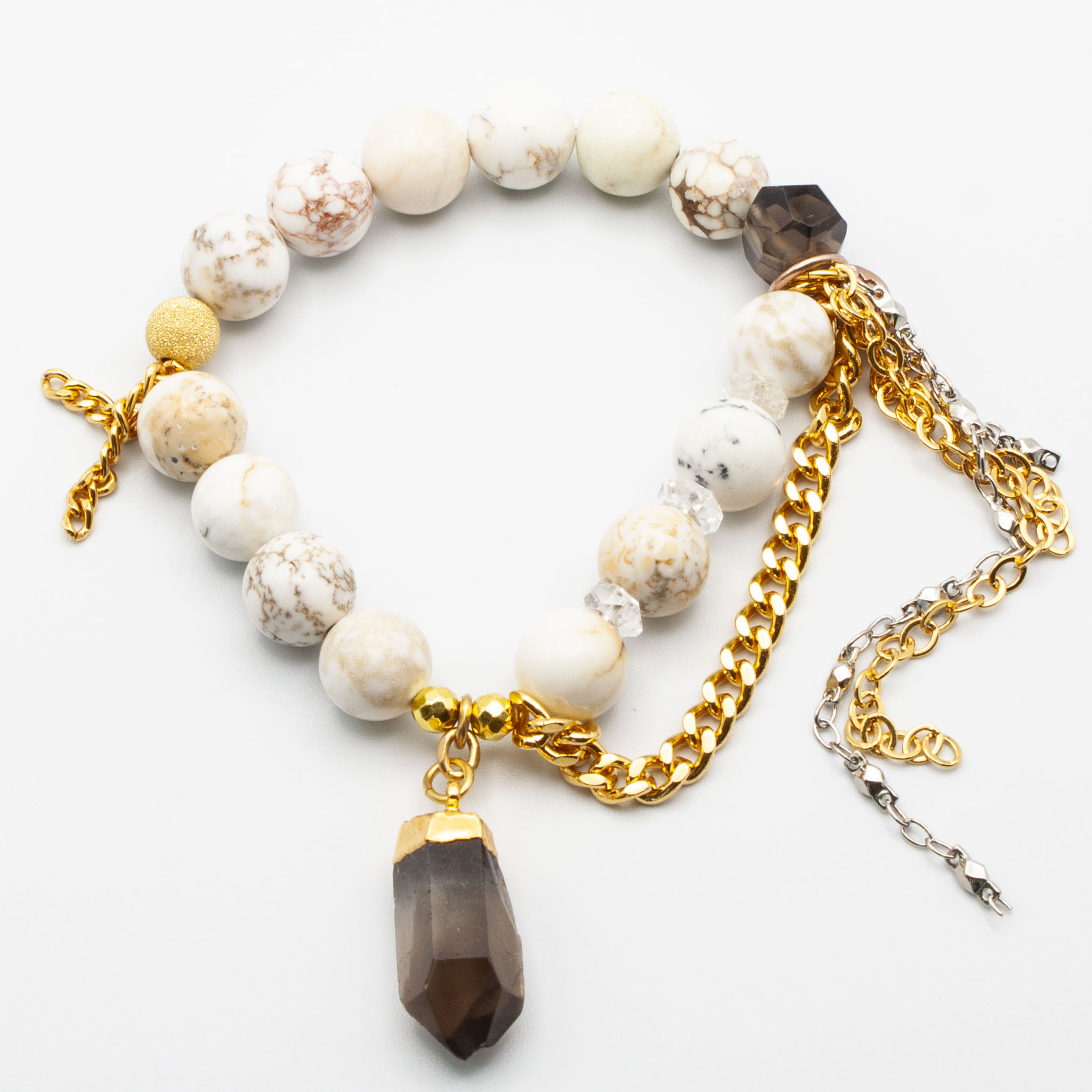 White turquoise with a 18kt gold plate wrapped smoky quartz crystal pendant. 18kt gold stardust accent bead and gold rhodium chain and tasseling. 10mm 7 inch stretch bracelet.